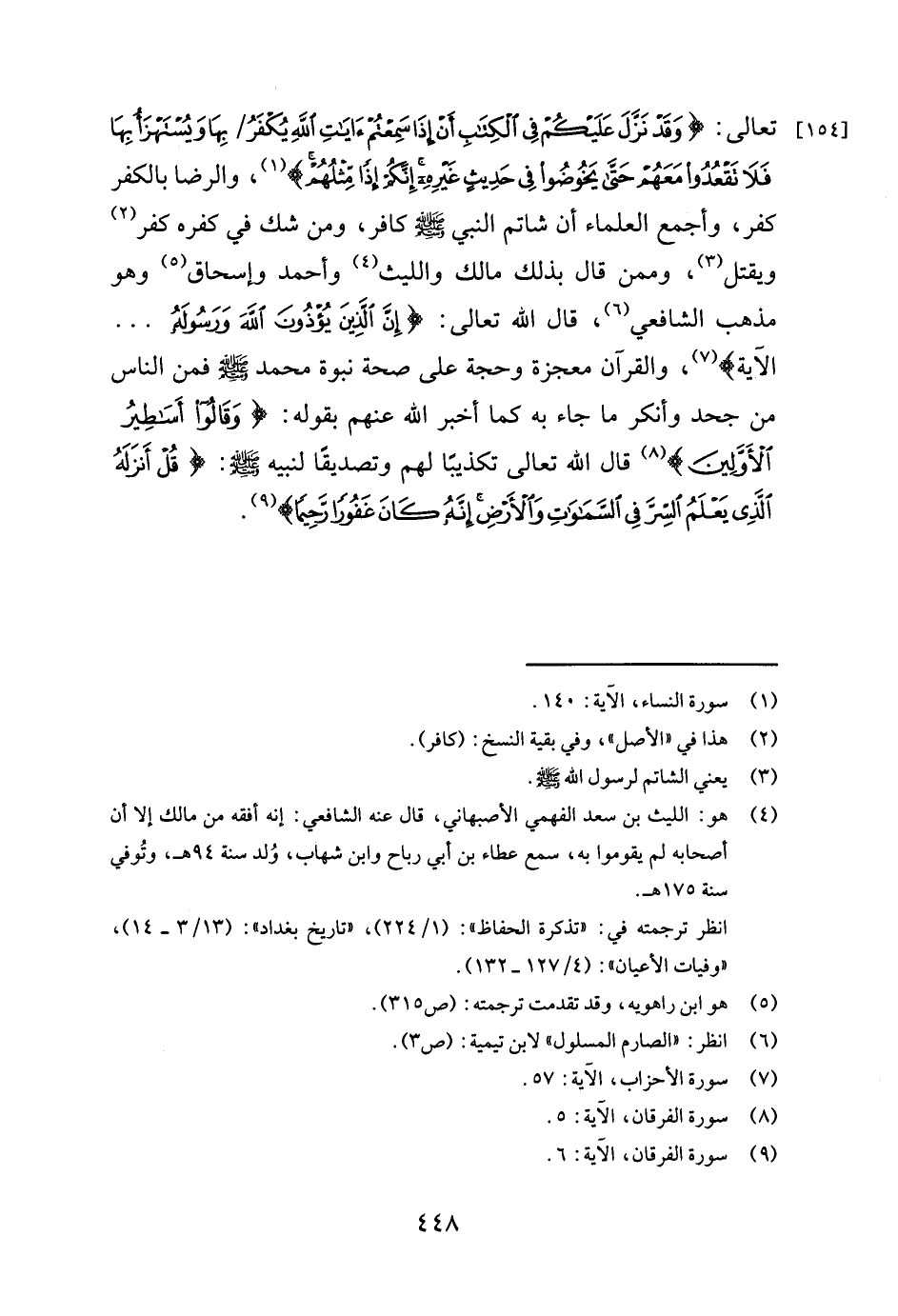 تعالى: {وَقَدْ نَزَّلَ عَلَيْكُمْ فِي الْكِتَابِ أَنْ إِذَا سَمِعْتُمْ آيَاتِ اللَّهِ يُكْفَرُ بِهَا وَيُسْتَهْزَأُ بِهَا فَلا تَقْعُدُوا مَعَهُمْ حَتَّى يَخُوضُوا فِي حَدِيثٍ غَيْرِهِ إِنَّكُمْ إِذاً مِثْلُهُمْ} 1 والرضا بالكفر كفر، وأجمع العلماء أن شاتم النبي صلى الله عليه وسلم كافر، ومن شك في كفره كفر2 ويقتل3 وممن قال بذلك مالك والليث4 وأحمد وإسحاق5 وهو مذهب الشافعي6 قال الله تعالى: {إِنَّ الَّذِينَ يُؤْذُونَ اللَّهَ وَرَسُولَهُ} 7 والقرآن معجزة وحجة على صحة نبوة محمد صلى الله عليه وسلم فمن الناس من جحد وأنكر ما جاء به كما أخبر الله عنهم بقوله: {وَقَالُوا أَسَاطِيرُ الأَوَّلِينَ} 8 قال الله تعالى تكذيبا لهم وتصديقا لنبيه صلى الله عليه وسلم {قُلْ أَنْزَلَهُ الَّذِي يَعْلَمُ السِّرَّ فِي السَّمَاوَاتِ وَالأَرْضِ إِنَّهُ كَانَ غَفُوراً رَحِيماً} 9