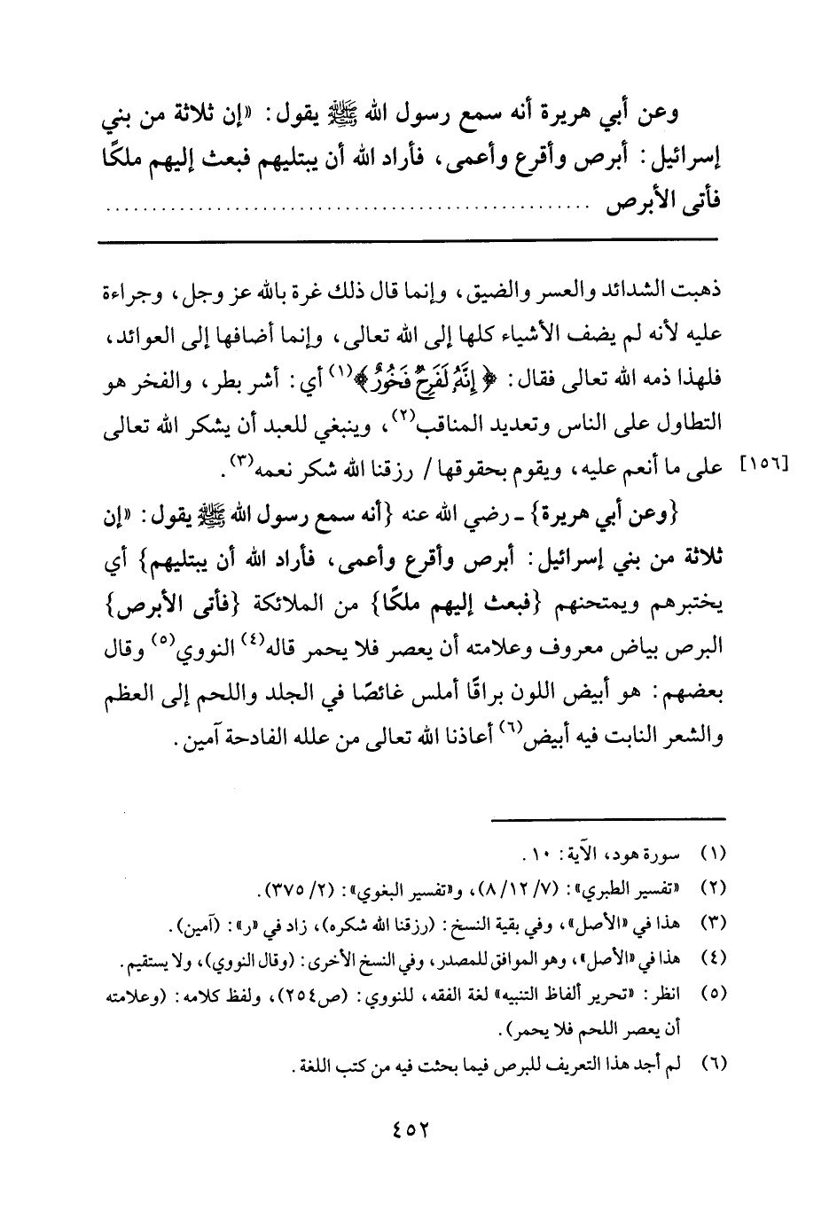 وعن أبي هريرة أنه سمع رسول الله صلى الله عليه وسلم يقول: " إن ثلاثة من بني إسرائيل: أبرص وأقرع وأعمى، فأراد الله أن يبتليهم فبعث إليهم ملكا فأتى الأبرص