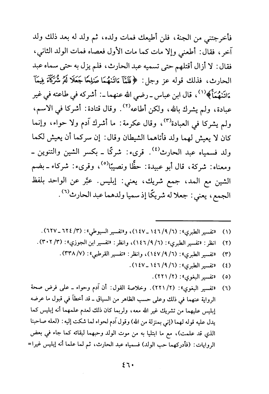 6"تفسير البغوي": (2/ 221) . وخلاصة القول: أن آدم وحواء- على فرض صحة الرو، الآية عنهما في ذلك وعلى حسب الظاهر من السياق- قد أخطأ في قبول ما عرضه إبليس عليهما من تشريك غير الله معه, ولربما كان ذلك لعدم علمهما أنه إبليس كما يدل عليه قوله لهما (إني بمنزلة من الله) وقول آدم لحواء لما شكت إليه: (لعله صاحبنا الذي قد علمت) , مع ما ابتليا به من موت الولد وحبهما لبقائه كما جاء في بعض الروايات: (فأدركهما حب الولد) فسمياه عبد الحارث, ثم لما علما أنه إبليس غيرا ذلك الاسم وتابا ويدل على ذلك أنه لم يعلم في التاريخ ولا النصوص أن من أبناء آدم من يقال له: عبد الحارث. وإن كان المراد أن الذم لغير آدم وحواء وإنما كان لبعض نسلهما من بني آدم كما رجحه بعض أهل العلم فلا إشكال, وهذا يأباه سياق ال، الآية. وتحقيق هذه المسألة يحتاج إلى جمع النصوص والحكم عليها والمقارنة بين الصحيح منها وغيره ومحاولة التوفيق والجمع بين ما صح منها.