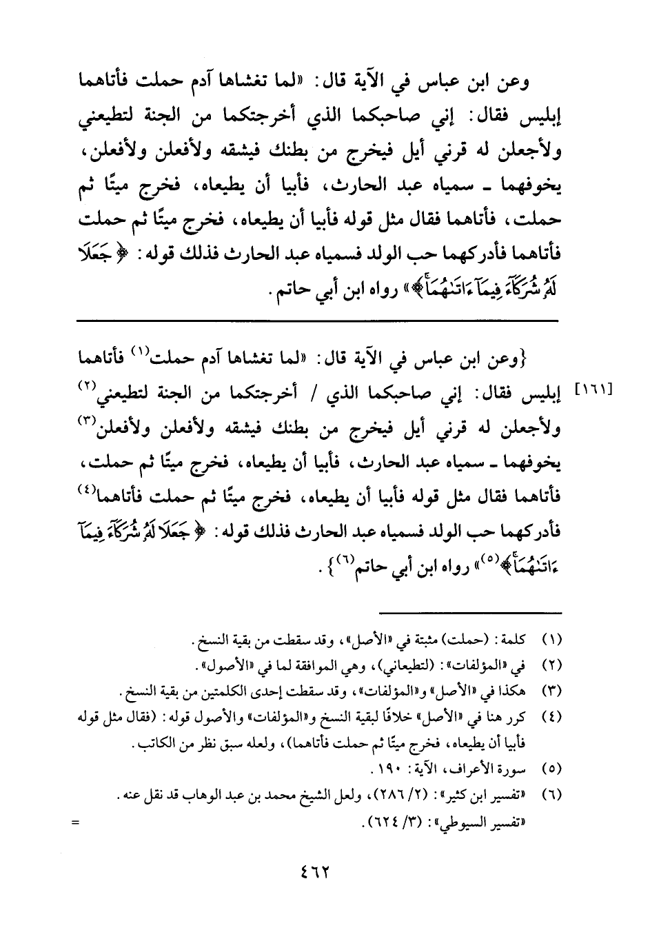 {وعن ابن عباس في الآية قال:"لما تغشاها آدم حملت1 فأتاهما إبليس فقال: إني صاحبكما الذي أخرجتكما من الجنة لتطيعني2 ولأجعلن له قرني أيل فيخرج من بطنك فيشقه ولأفعلن ولأفعلن3 يخوفهما - سمياه عبد الحارث، فأبيا أن يطيعاه، فخرج ميتا ثم حملت، فأتاهما فقال مثل قوله فأبيا أن يطيعاه، فخرج ميتا ثم حملت فأتاهما4 فأدركهما حب الولد فسمياه عبد الحارث فذلك قوله: {جَعَلا لَهُ شُرَكَاءَ فِيمَا آتَاهُمَا} 5 رواه ابن أبي حاتم6} .