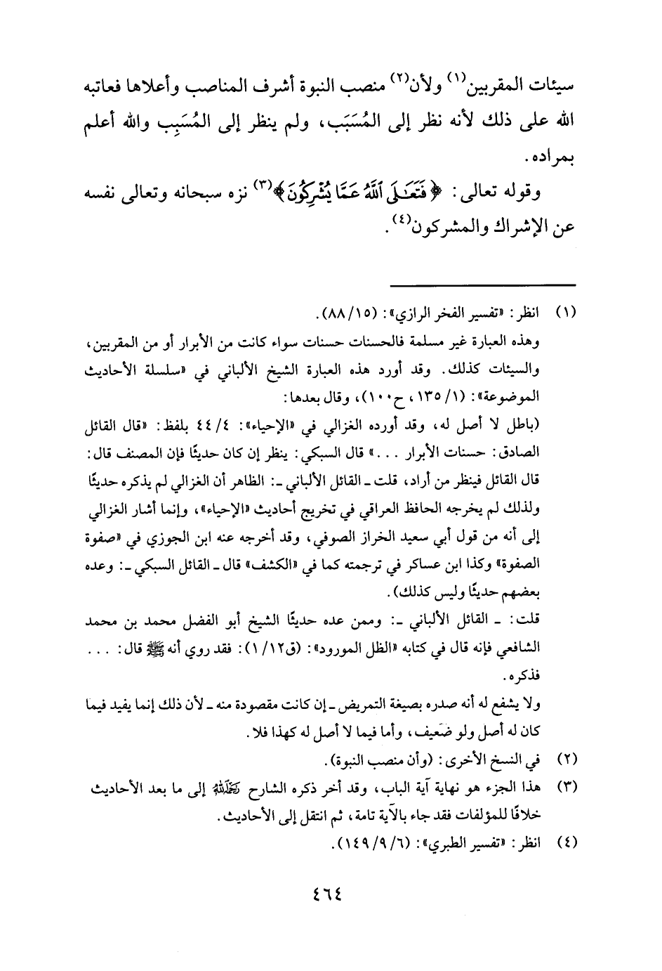 1 انظر:"تفسير الفخر الرازي": (15/ 88) . وهذه العبارة غير مسلمة فالحسنات حسنات سواء كانت من الأبرار أو من المقربين, والسيئات كذلك. وقد أورد هذه العبارة الشيخ الألباني في"سلسلة الأحاديث الموضوعة": (1/ 135 , ح 100) , وقال بعدها: (باطل لا أصل له, وقد أورده الغزالي في"الإحياء": 4/ 44 بلفظ:"قال القائل الصادق: حسنات الأبرار ... "قال السبكي: ينظر إن كان حديثا فإن المصنف قال: قال القائل فينظر من أراد, قلت -القائل الألباني-: الظاهر أن الغزالي لم يذكره حديثا ولذلك لم يخرجه الحافظ العراقي في تخريج أحاديث "الإحياء", وإنما أشار الغزالي إلى أنه من قول أبي سعيد الخراز الصوفي, وقد أخرجه عنه ابن الجوزي في"صفوة الصفوة"وكذا ابن عساكر في ترجمته كما في "الكشف" قال -القائل السبكي-: وعده بعضهم حديثا وليس كذلك) . قلت: -القائل الألباني-: وممن عده حديثا الشيخ أبو الفضل محمد بن محمد الشافعي فإنه قال في كتابه"الظل المورود": (ق 12/ 1) : فقد روي أنه صلى الله عليه وسلم قال: 000 فذكره. ولا يشفع له أنه صدره بصيغة التمريض -إن كانت مقصودة منه- لأن ذلك إنما يفيد فيما كان له أصل ولو ضعيف, وأما فيما لا أصل له كهذا فلا.