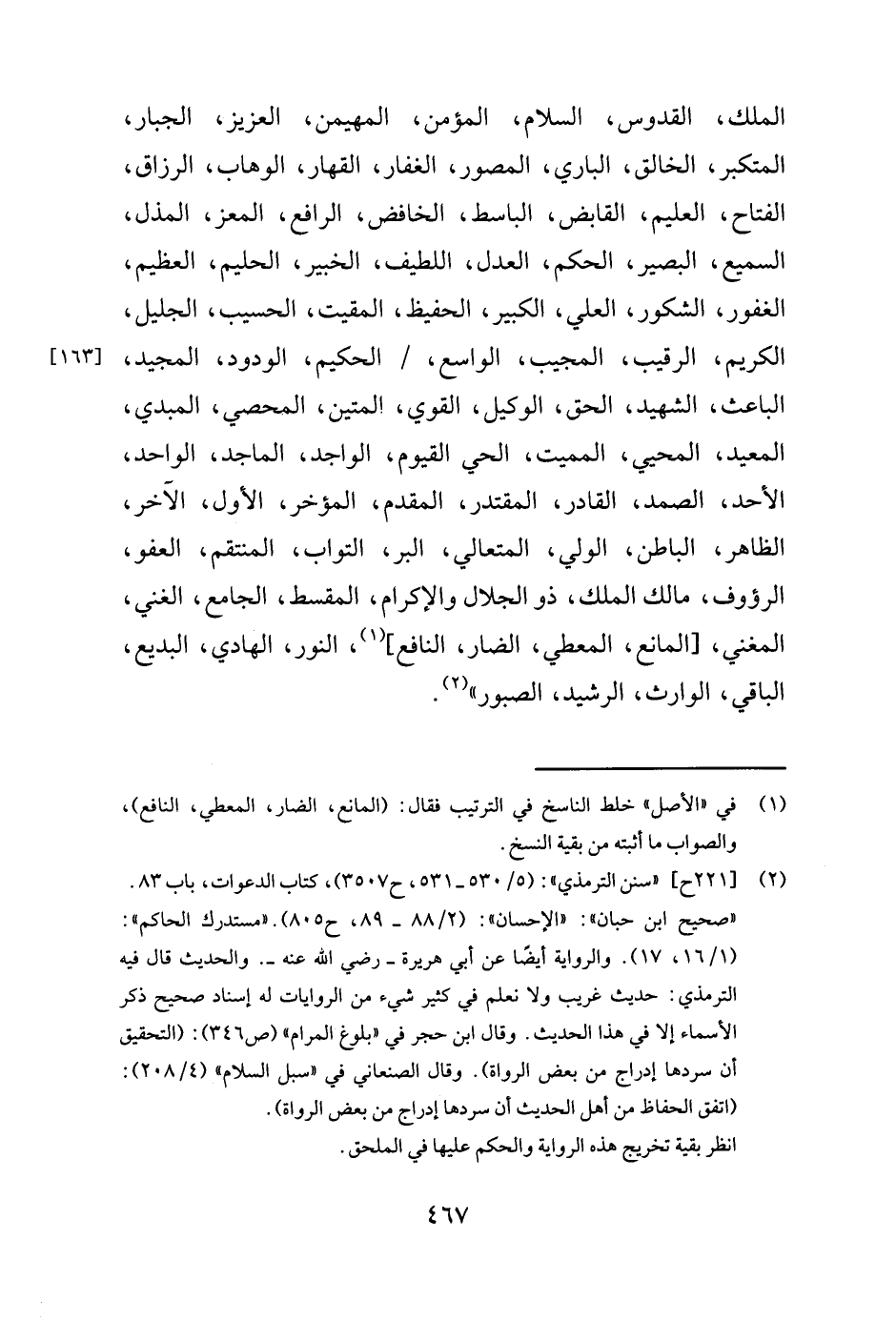 الملك، القدوس، السلام، المؤمن، المهيمن، العزيز، الجبار، المتكبر، الخالق، الباري، المصور، الغفار، القهار، الوهاب، الرزاق، الفتاح، العليم، القابض، الباسط، الخافض، الرافع، المعز، المذل، السميع، البصير، الحكم، العدل، اللطيف، الخبير، الحليم، العظيم، الغفور، الشكور، العلي، الكبير، الحفيظ، المقيت، الحسيب، الجليل، الكريم، الرقيب، المجيب، الواسع، الحكيم، الودود، المجيد، الباعث، الشهيد، الحق، الوكيل، القوي، المتين، المحصي، المبدي، المعيد، المحيي، المميت، الحي القيوم، الواجد، الماجد، الواحد، الأحد، الصمد، القادر، المقتدر، المقدم، المؤخر، الأول، الآخر، الظاهر، الباطن، الولي، المتعالي، البر، التواب، المنتقم، العفو، الرءوف، مالك الملك، ذو الجلال والإكرام، المقسط، الجامع، الغني، المغني، [المانع، المعطي، الضار، النافع] 1 النور، الهادي، البديع، الباقي، الوارث، الرشيد، الصبور " 2.