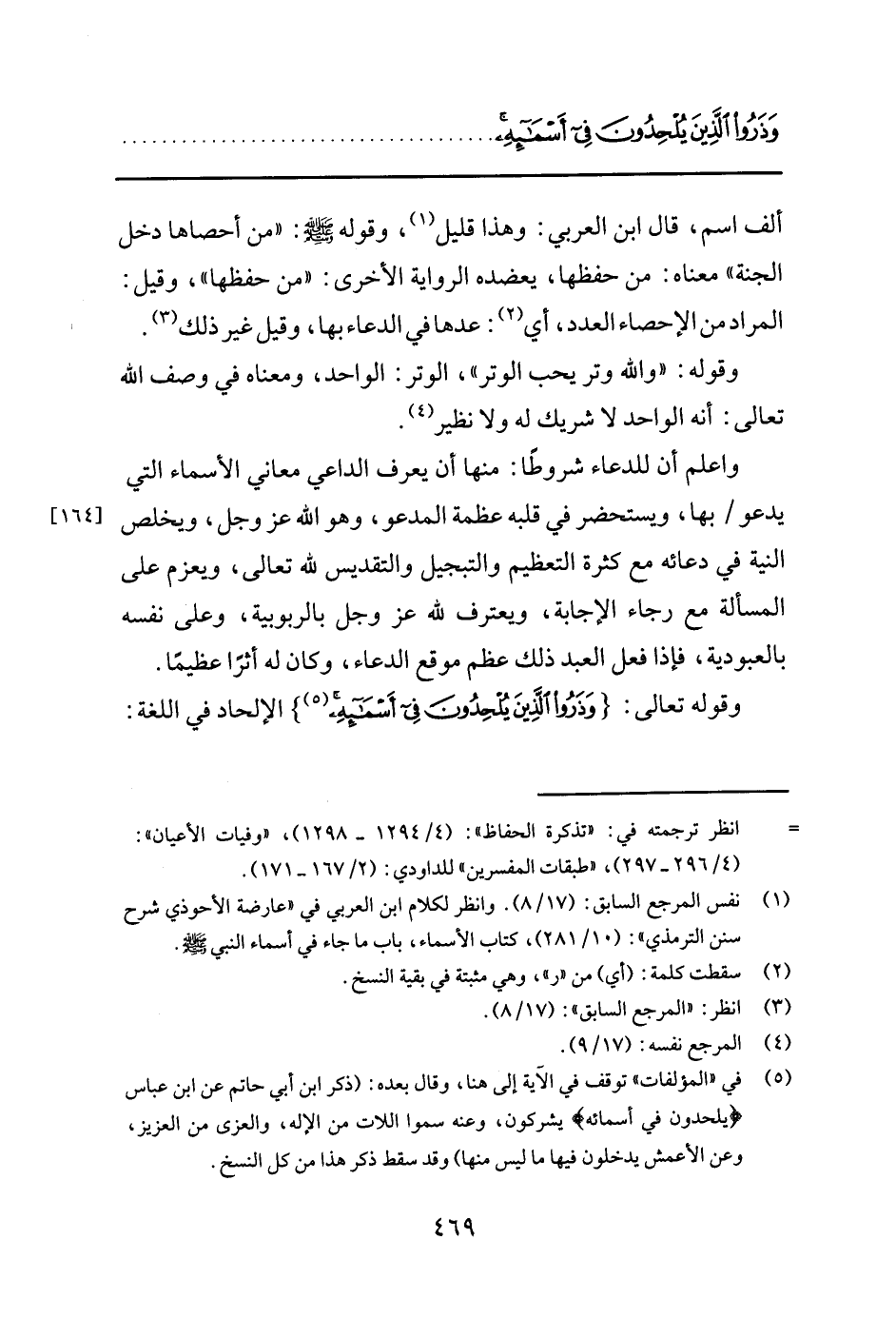 7 في "المؤلفات" توقف في الآية إلى هنا، وقال بعده: (ذكر ابن أبي حاتم عن ابن عباس {يُلْحِدُونَ فِي أَسْمَائِهِ} يشركون،، وعنه سموا اللات من الإله، والعزى من العزيز، وعن الأعمش: يدخلون فيها ما ليس منها) وقد سقط ذكر هذا من كل النسخ.