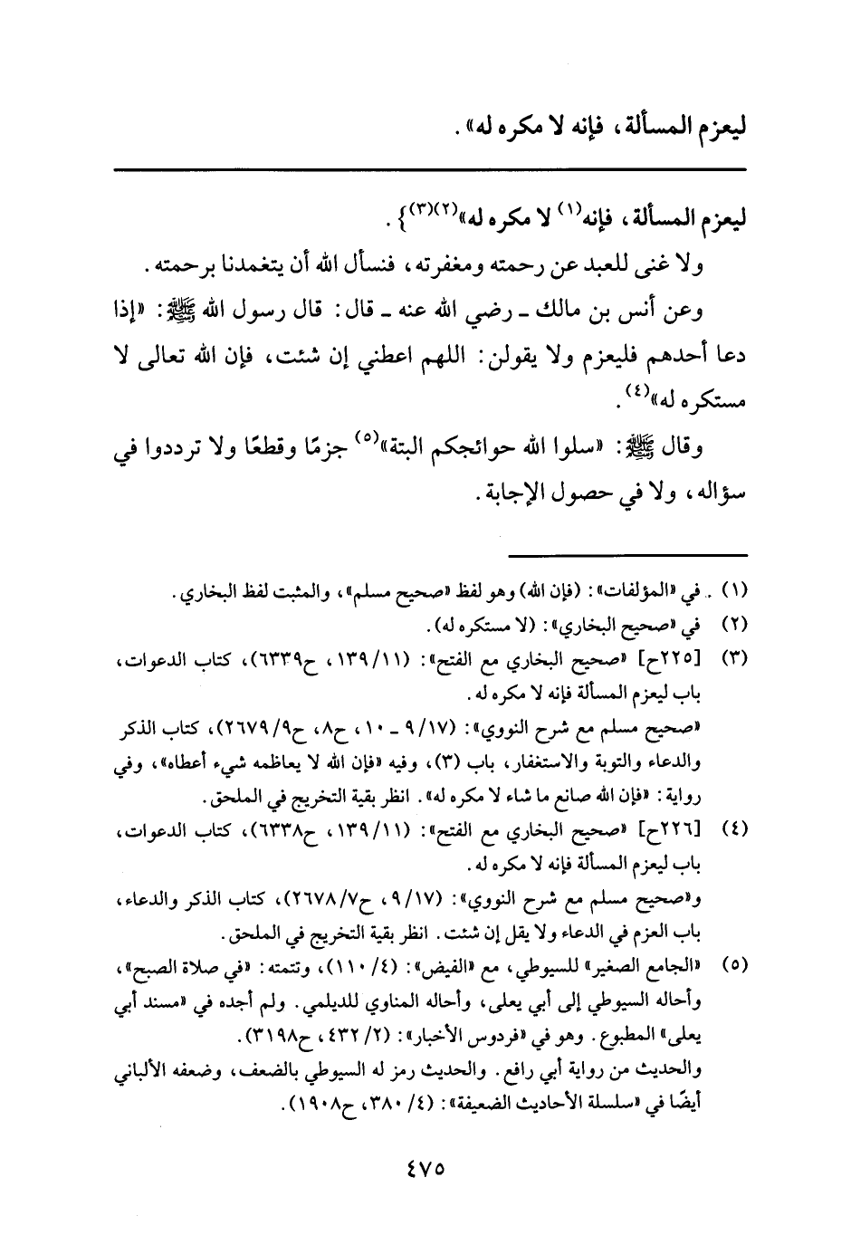4 [226 ح] "صحيح البخاري مع الفتح": (11/ 139 , ح 6338) , كتاب الدعوات, باب ليعزم المسألة فإنه لا مكره له. و"صحيح مسلم مع شرح النووي": (17/ 9 , ح 7/ 2678) , كتاب الذكر والدعاء, باب العزم في الدعاء ولا يقل إن شئت. انظر بقية التخريج في الملحق.