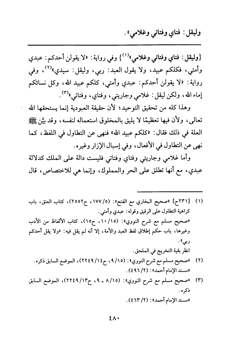 {وليقل: فتاي وفتاتي وغلامي "1} وفي رواية: " لا يقولن أحدكم: عبدي وأمتي، فكلكم عبيد، ولا يقول العبد: ربي، وليقل: سيدي " 2 وفي رواية: " لا يقولن أحدكم: عبدي وأمتي، كلكم عبيد الله، وكل نسائكم إماء الله، ولكن ليقل: غلامي وجاريتي، وفتاي، وفتاتي " 3.