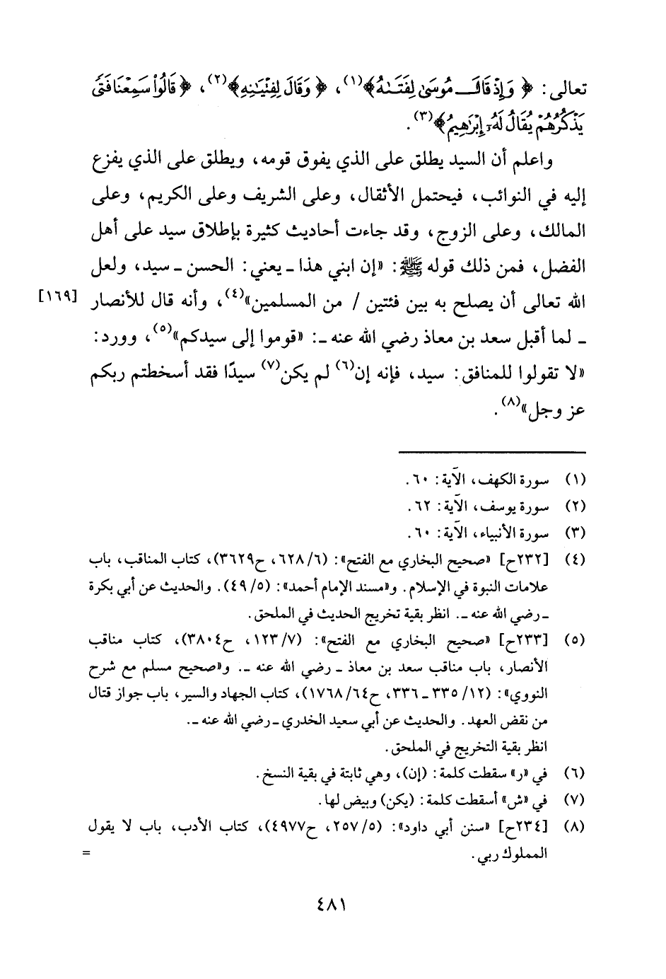 واعلم أن السيد يطلق على الذي يفوق قومه، ويطلق على الذي يفزع إليه في النوائب، فيحتمل الأثقال، وعلى الشريف وعلى الكريم، وعلى المالك، وعلى الزوج، وقد جاءت أحاديث كثيرة بإطلاق سيد على أهل الفضل، فمن ذلك قوله صلى الله عليه وسلم "إن ابني هذا - يعني: الحسن - سيد، ولعل الله تعالى أن يصلح به بين فئتين من المسلمين "4 وأنه قال للأنصار - لما أقبل سعد بن معاذ رضي الله عنه-:" قوموا إلى سيدكم "5 وورد:" لا تقولوا للمنافق: سيد، فإنه إن6 لم يكن7 سيدا فقد أسخطتم ربكم عز وجل ".8