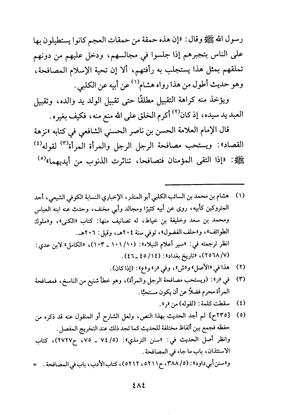 قال الإمام العلامة الحسن بن ناصر الحسني الشافعي في كتابه"نزهة القصاد": ويستحب مصافحة الرجل الرجل والمرأة المرأة3 لقوله4 صلى الله عليه وسلم "إذا التقى المؤمنان فتصافحا، تناثرت الذنوب من أيديهما" 5.