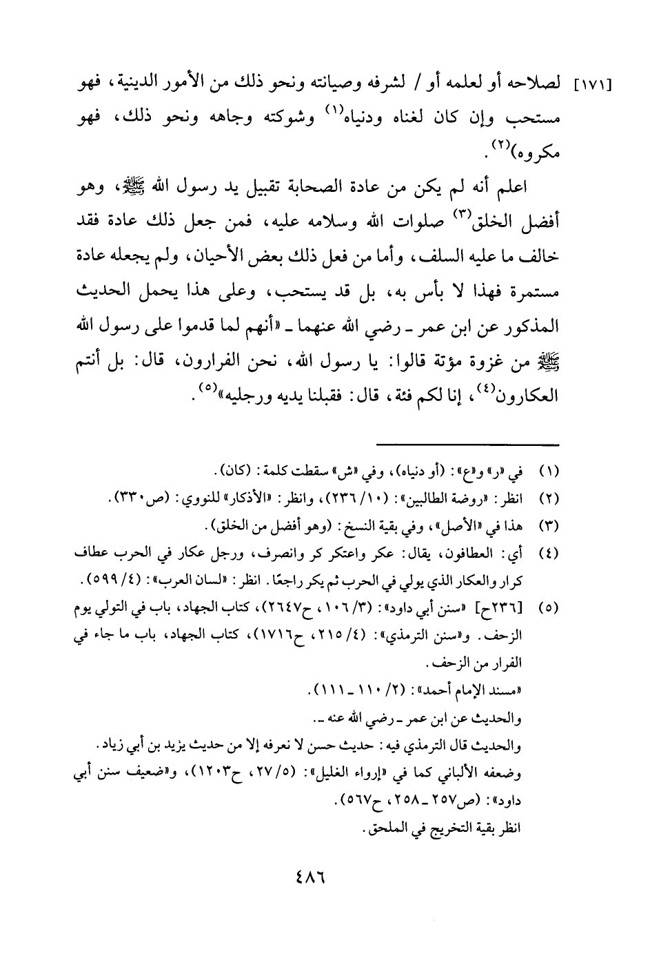اعلم أنه لم يكن من عادة الصحابة تقبيل يد رسول الله صلى الله عليه وسلم وهو أفضل الخلق3 صلوات الله وسلامه عليه، فمن جعل ذلك عادة فقد خالف ما عليه السلف، وأما من فعل ذلك بعض الأحيان، ولم يجعله عادة مستمرة فهذا لا بأس به، بل قد يستحب، وعلى هذا يحمل الحديث المذكور عن ابن عمر - رضي الله عنهما - " أنهم لما قدموا على رسول الله صلى الله عليه وسلم من غزوة مؤتة قالوا: يا رسول الله، نحن الفرارون، قال: بل أنتم العكارون 4 إنا لكم فئة، قال: فقبلنا يديه ورجليه " 5.