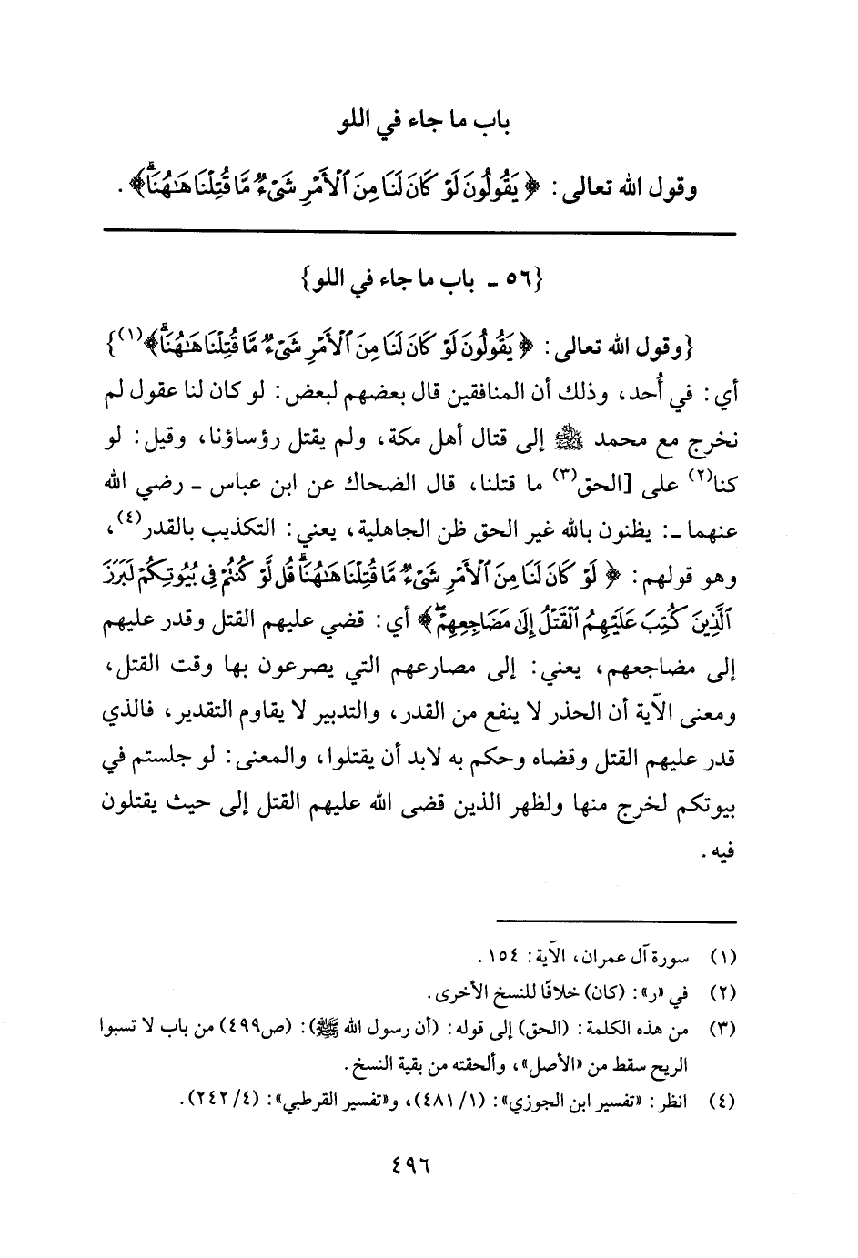 {وقول الله تعالى: {يَقُولُونَ لَوْ كَانَ لَنَا مِنَ الأَمْرِ شَيْءٌ مَا قُتِلْنَا هَاهُنَا} 1} أي: في أحد، وذلك أن المنافقين قال بعضهم لبعض: لو كان لنا عقول لم نخرج مع محمد صلى الله عليه وسلم إلى قتال أهل مكة، ولم يقتل رؤساؤنا، وقيل: لو كنا2 على [الحق3 ما قتلنا، قال الضحاك عن ابن عباس - رضي الله عنهما -: يظنون بالله غير الحق ظن الجاهلية، يعني: التكذيب بالقدر4 وهو قولهم: {لَوْ كَانَ لَنَا مِنَ الأَمْرِ شَيْءٌ مَا قُتِلْنَا هَاهُنَا قُلْ لَوْ كُنْتُمْ فِي بُيُوتِكُمْ لَبَرَزَ الَّذِينَ كُتِبَ عَلَيْهِمُ الْقَتْلُ إِلَى مَضَاجِعِهِمْ} 5 أي: قضي عليهم القتل وقدر عليهم إلى مضاجعهم، يعني: إلى مصارعهم التي يصرعون بها وقت القتل، ومعنى الآية أن الحذر لا ينفع من القدر، والتدبير لا يقاوم التقدير، فالذي قدر عليهم القتل وقضاه وحكم به لابد أن يقتلوا، والمعنى: لو جلستم في بيوتكم لخرج منها ولظهر الذين قضى الله عليهم القتل إلى حيث يقتلون فيه.