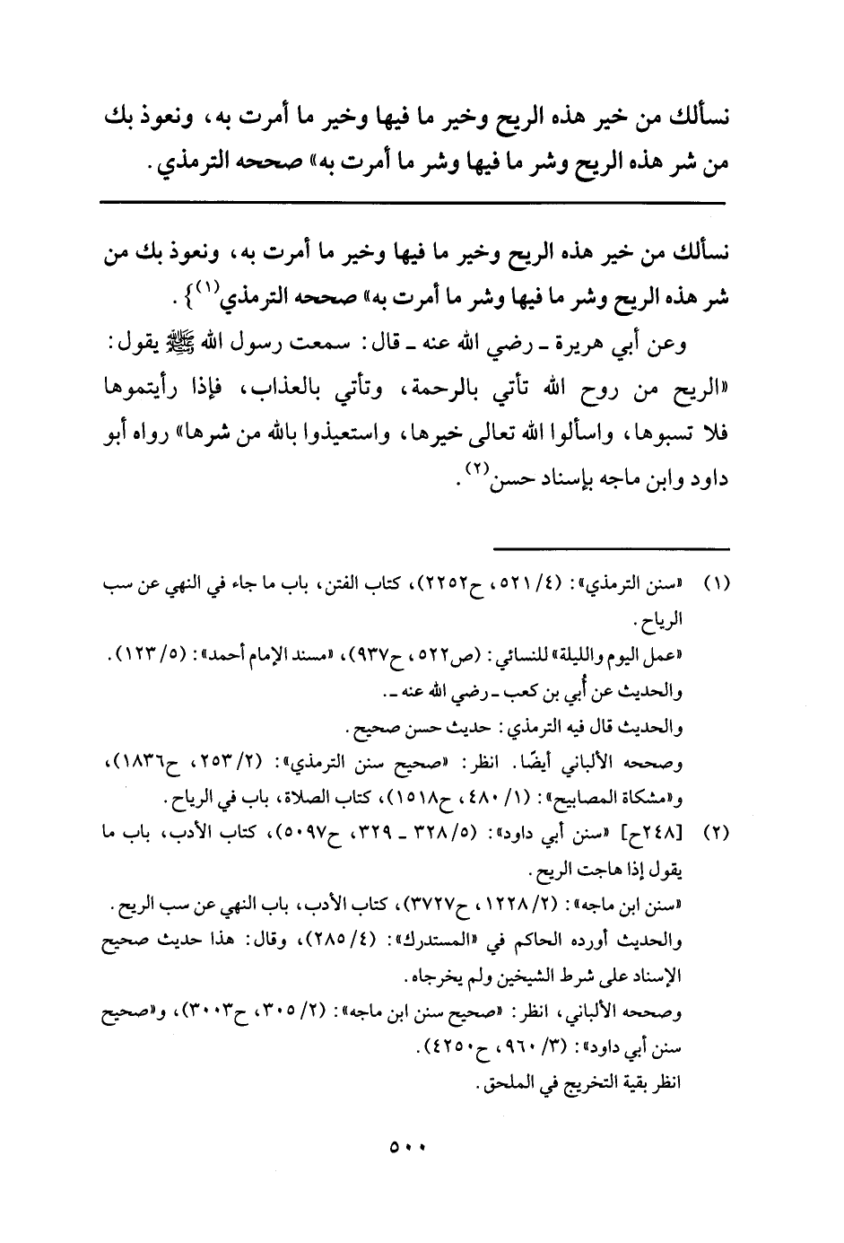 1"سنن الترمذي": (4/ 521 , ح 2252) , كتاب الفتن, باب ما جاء في النهي عن سب الرياح."عمل اليوم والليلة"للنسائي: (ص 522 , ح 937) ,"مسند الإمام أحمد": (5/ 123) . والحديث عن أبي بن كعب -رضي الله عنه-. والحديث قال فيه الترمذي: حديث حسن صحيح. وصححه الألباني أيضا. انظر:"صحيح سنن الترمذي": (2/ 253 , ح 1836) , و"مشكاة المصابيح": (1/ 480 , ح 1518) , كتاب الصلاة, باب في الرياح.