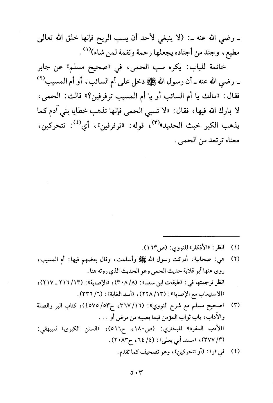 خاتمة للباب: يكره سب الحمى، في "صحيح مسلم" عن جابر رضي الله عنه أن رسول الله صلى الله عليه وسلم دخل على أم السائب، أو أم المسيب2 فقال: " ما لك يا أم السائب أو يا أم المسيب ترفرفين؟ قالت: الحمى، لا بارك الله فيها، فقال: لا تسبي الحمى فإنها تذهب خطايا بني آدم كما يذهب الكير خبث الحديد " 3 قوله:"ترفرفين"، أي4 تتحركين، معناه ترتعد من الحمى.