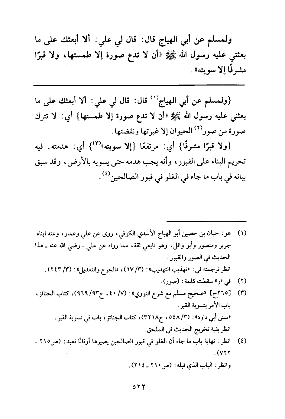 ولمسلم عن أبي الهياج قال: قال لي علي " ألا أبعثك على ما بعثني عليه رسول الله صلى الله عليه وسلم أن لا تدع صورة إلا طمستها، ولا قبرا مشرفا إلا سويته ".