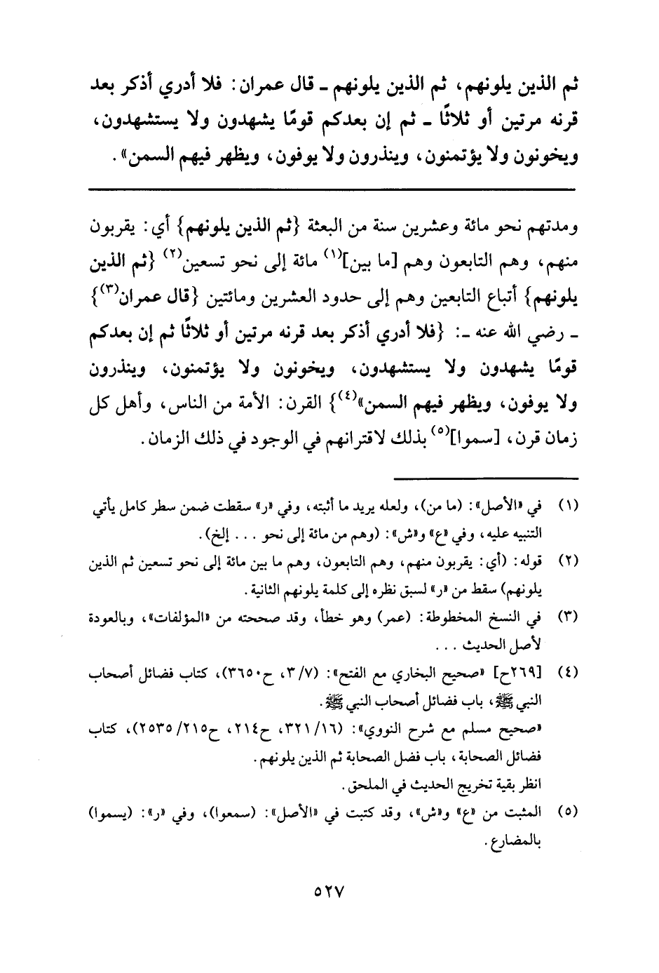 ثم الذين يلونهم، ثم الذين يلونهم - قال عمران: فلا أدري أذكر بعد قرنه مرتين أو ثلاثا - ثم إن بعدكم قوما يشهدون ولا يستشهدون، ويخونون ولا يؤتمنون، وينذرون ولا يوفون، ويظهر فيهم السمن "