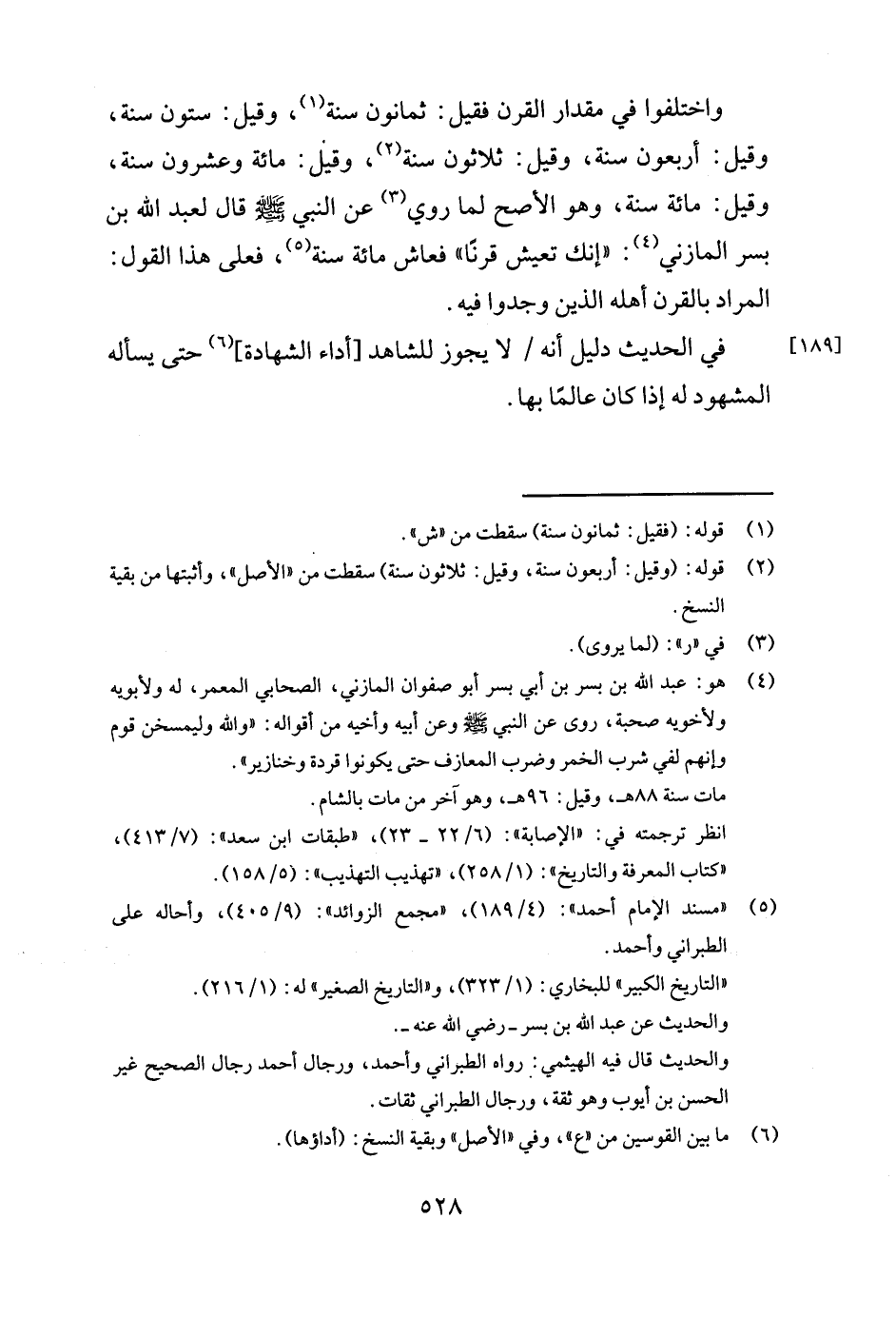 واختلفوا في مقدار القرن فقيل: ثمانون سنة1 وقيل: ستون سنة، وقيل: أربعون سنة، وقيل: ثلاثون سنة2 وقيل: مائة وعشرون سنة، وقيل: مائة سنة، وهو الأصح لما روي3 عن النبي صلى الله عليه وسلم قال لعبد الله بن بسر المازني4" إنك تعيش قرنا " فعاش مائة سنة5 فعلى هذا القول: المراد بالقرن أهله الذين وجدوا فيه. في الحديث دليل أنه لا يجوز للشاهد [أداء الشهادة] 6 حتى يسأله المشهود له إذا كان عالما بها.