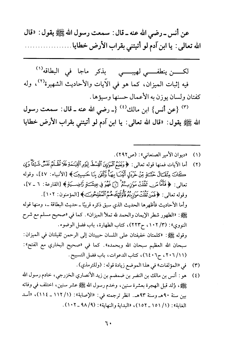 3 {عن أنس} ابن مالك4 {-رضي الله عنه- قال: سمعت رسول الله صلى الله عليه وسلم يقول: " قال الله تعالى: يا ابن آدم لو أتيتني بقراب الأرض خطايا