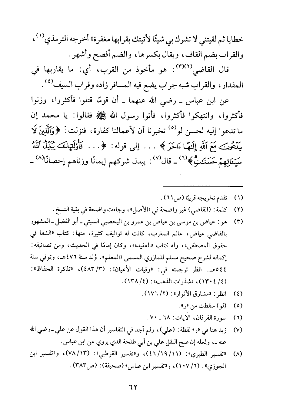 قال القاضي34 هو مأخوذ من القرب، أي: ما يقاربها في المقدار، والقراب شبه جراب يضع فيه المسافر زاده وقراب السيف5. عن ابن عباس -رضي الله عنهما- " أن قوما قتلوا فأكثروا، وزنوا فأكثروا، وانتهكوا فأكثروا، فأتوا رسول الله صلى الله عليه وسلم فقالوا: يا محمد إن ما تدعوا إليه لحسن لو6 تخبرنا أن لأعمالنا كفارة، فنزلت: {وَالَّذِينَ لا يَدْعُونَ مَعَ اللَّهِ إِلَهاً آخَرَ} . إلى قوله: {فَأُولَئِكَ يُبَدِّلُ اللَّهُ سَيِّئَاتِهِمْ حَسَنَات…ٍ} 7 8"- قال: يبدل شركهم إيمانًا وزناهم إحصانًا9.