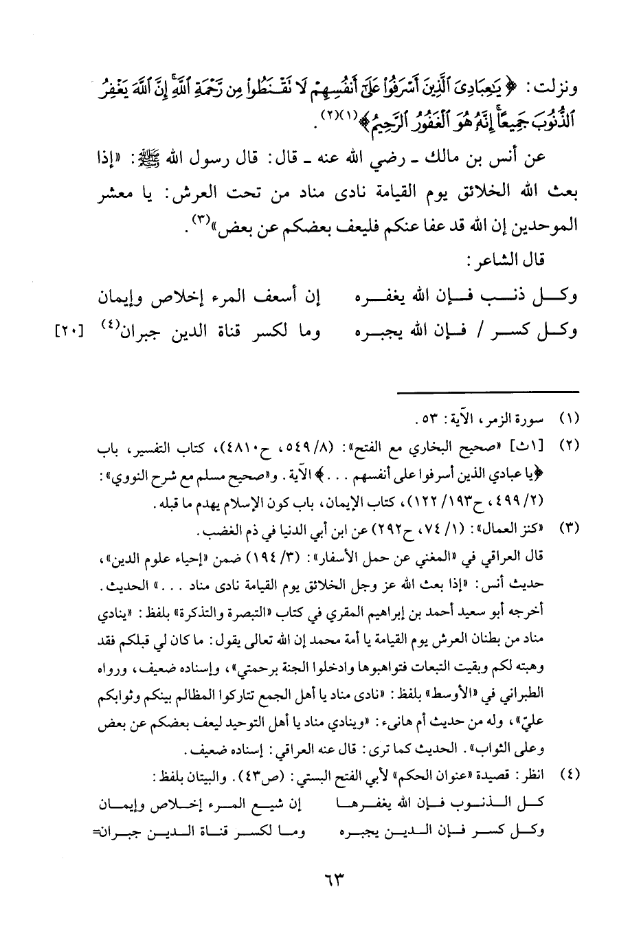 عن أنس بن مالك رضي الله عنه قال: قال رسول الله صلى الله عليه وسلم " إذا بعث الله الخلائق يوم القيامة نادى مناد من تحت العرش: يا معشر الموحدين إن الله قد عفا عنكم فليعف بعضكم عن بعض "3 قال الشاعر: