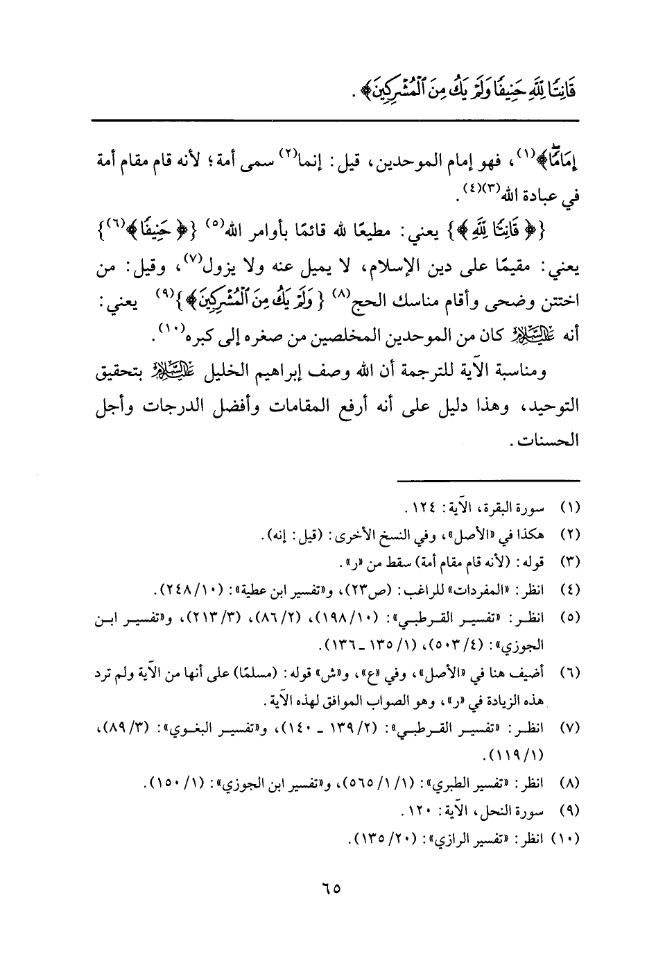 {قَانِتاً لِلَّهِ حَنِيفاً وَلَمْ يَكُ مِنَ الْمُشْرِكِينَ} 2.