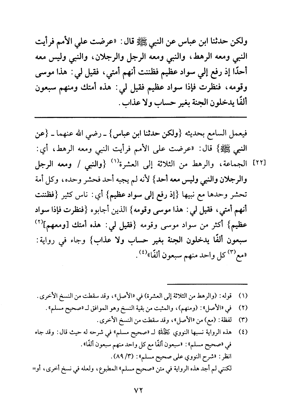 ولكن حدثنا ابن عباس عن النبي صلى الله عليه وسلم قال: " عرضت علي الأمم فرأيت النبي ومعه الرهط، والنبي ومعه الرجل والرجلان، والنبي وليس معه أحدًا إذ رفع إلي سواد عظيم فظننت أنهم أمتي، فقيل لي: هذا موسى وقومه، فنظرت فإذا سواد عظيم فقيل لي: هذه أمتك ومنهم سبعون ألفًا يدخلون الجنة بغير حساب ولا عذاب.