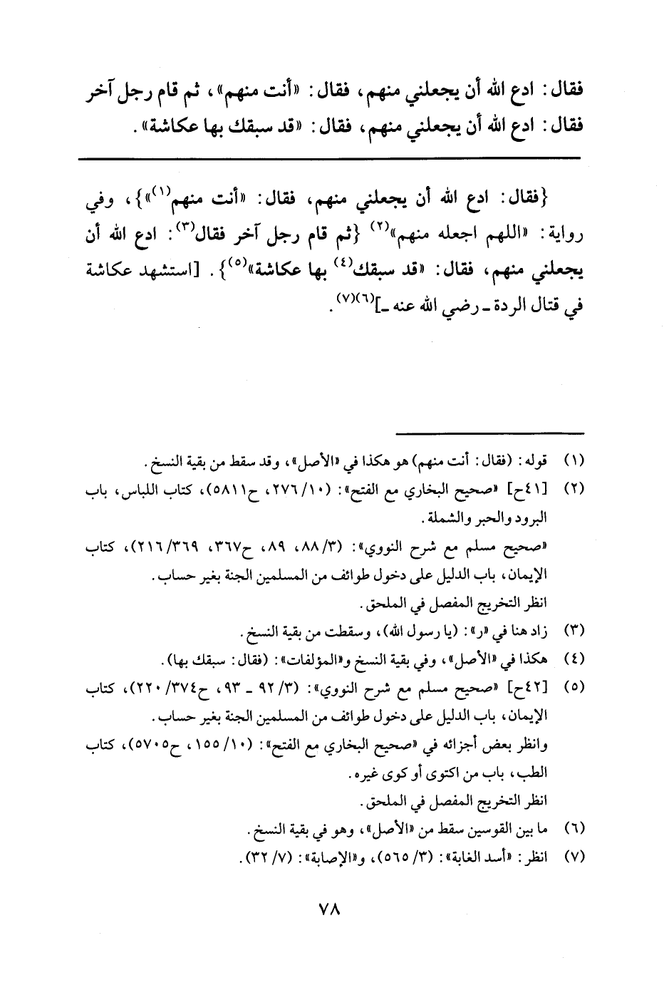 {فقال: ادع الله أن يجعلني منهم، فقال: " أنت منهم 2 "} " وفي رواية: "اللهم اجعله منهم3 " {ثم قام رجل آخر فقال4 ادع الله أن يجعلني منهم، فقال: "قد سبقك5 بها عكاشة 6 "} " [استشهد عكاشة في قتال الردة - رضي الله عنه-] 78.