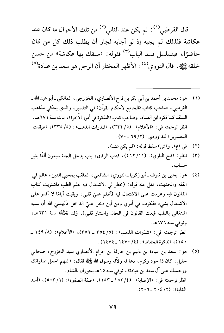 قال القرطبي1 لم يكن عند الثاني2 من تلك الأحوال ما كان عند عكاشة فلذلك لم يجبه إذ لو أجابه لجاز أن يطلب ذلك كل من كان حاضرا، فيتسلسل فسَدَّ الباب3 فقوله: " سبقك بها عكاشة " من حسن خلقه صلى الله عليه وسلم. قال النووي4 الأظهر المختار أن الرجل هو سعد بن عبادة5.