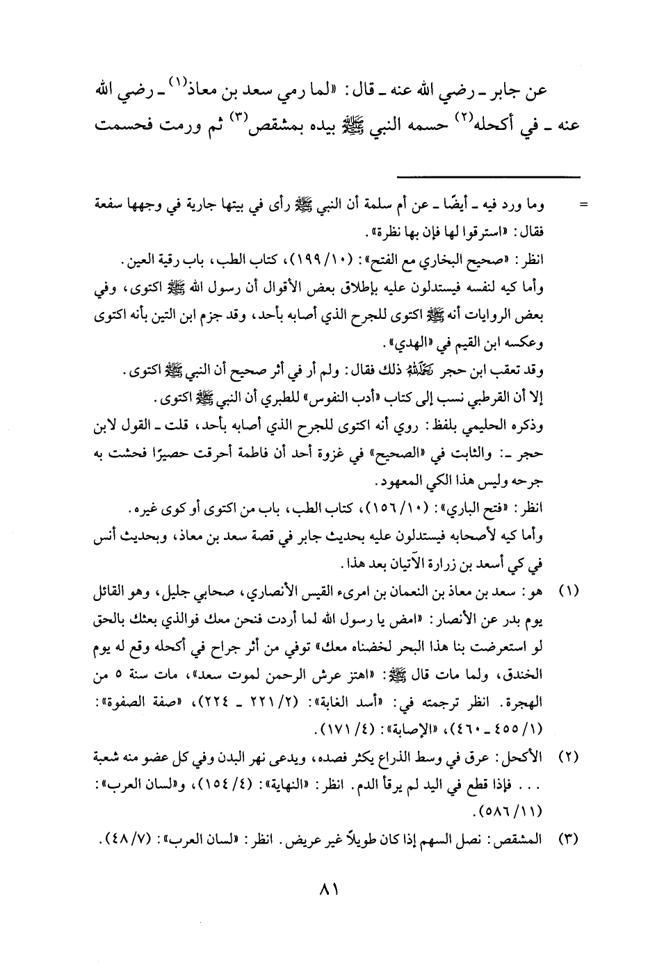عن جابر رضي الله عنه قال: " لما رمي سعد بن معاذ1 رضي الله عنه في أكحله2 حسمه النبي صلى الله عليه وسلم بيده بمشقص3 ثم ورمت فحسمت