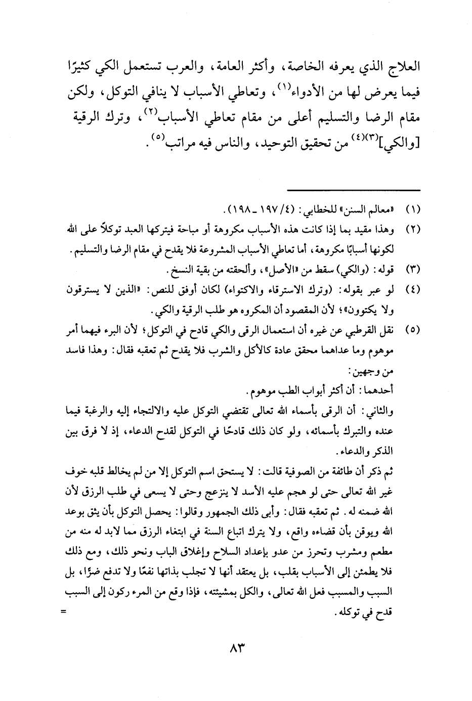 العلاج الذي يعرفه الخاصة، وأكثر العامة، والعرب تستعمل الكي كثيرًا فيما يعرض لها من الأدواء1 وتعاطي الأسباب لا ينافي التوكل، ولكن مقام الرضا والتسليم أعلى من مقام تعاطي الأسباب2 وترك الرقية [والكي] 34 من تحقيق التوحيد، والناس فيه مراتب5.