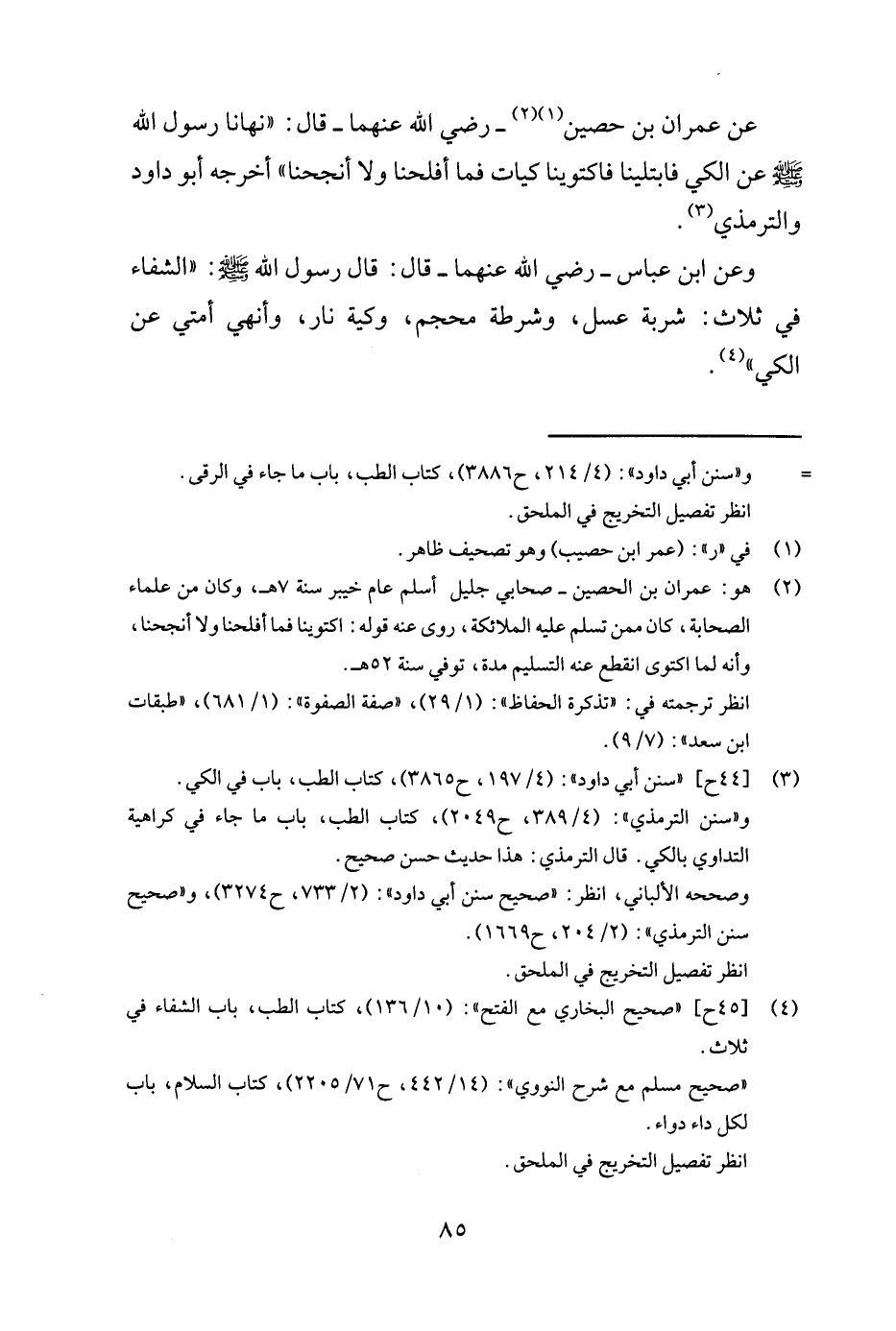 (4) [44 ح] ((سنن أبي داود)) : (4/ 197 , ح 3865) , كتاب الطب, باب في الكي. و ((سنن الترمذي)) : (4/ 389 , ح 2049) , كتاب الطب, باب ما جاء في كراهية التداوي بالكي. قال الترمذي: هذا حديث حسن صحيح. وصححه الألباني, انظر: ((صحيح سنن أبي داود)) : (2/ 733 , ح 3274) , و ((صحيح سنن الترمذي)) : (2/ 204 , ح 1669) .