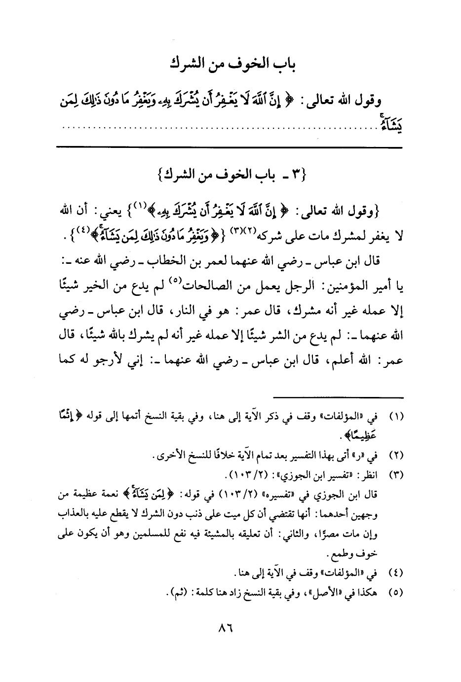 باب الخوف من الشرك وقول الله تعالى: {إِنَّ اللَّهَ لا يَغْفِرُ أَنْ يُشْرَكَ بِهِ وَيَغْفِرُ مَا دُونَ ذَلِكَ لِمَنْ يَشَاءُ} ............................................................