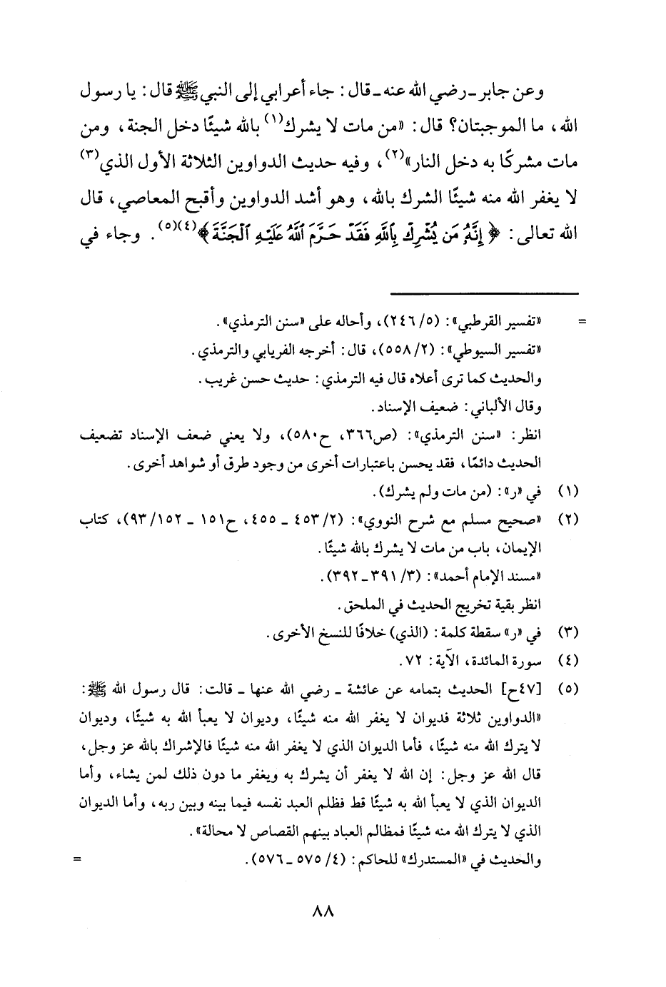 وعن جابر رضي الله عنه قال: جاء أعرابي إلى النبي صلى الله عليه وسلم قال: يا رسول الله، ما الموجبتان؟ قال: " من مات لا يشرك1 بالله شيئًا دخل الجنة، ومن مات مشركا به دخل النار "2 وفيه حديث الدواوين الثلاثة الأول الذي3 لا يغفر الله منه شيئًا الشرك بالله، وهو أشد الدواوين وأقبح المعاصي، قال الله تعالى: {إِنَّهُ مَنْ يُشْرِكْ بِاللَّهِ فَقَدْ حَرَّمَ اللَّهُ عَلَيْهِ الْجَنَّةَ} 45 وجاء في