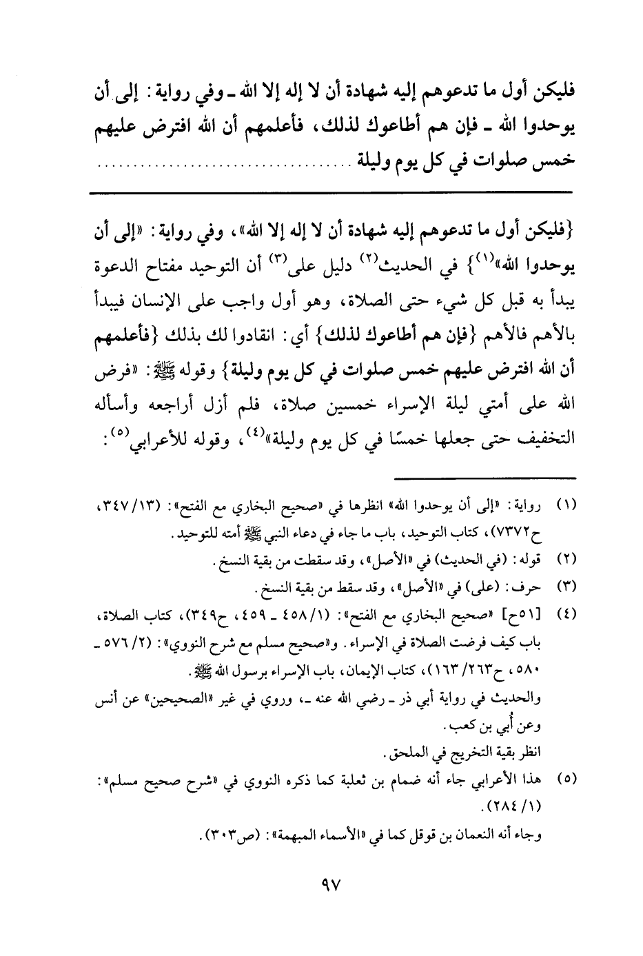 فليكن أول ما تدعوهم إليه شهادة أن لا إله إلا الله "1 - وفي رواية: (إلى أن يوحدوا الله- فإن هم أطاعوك لذلك، فأعلمهم أن الله افترض عليهم خمس صلوات في كل يوم وليلة..............................
