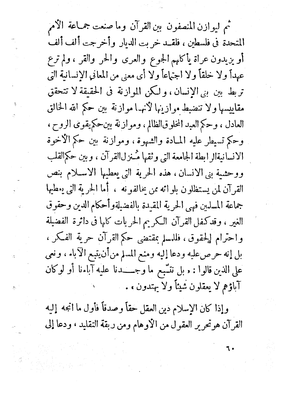 ثم ليوازن المنصفون بين القرآن وما صنعت جماعة الأمم المتحدة في فلسطين، فلقد خربت الديار وأخرجت ألف ألف أو يزيدون عراة يأكلهم الجوع والعري والحر والقر، ولم ترع عهداً ولا خلقاً ولا اجتماعاً ولا أي معنى من المعاني الإنسانية التي تربط بين بني الإنسان، ولكن الموازنة في الحقيقة لا تتحقق مقاييسها ولا تنضبط موازينها لأنها موازنة بين حكم الله الخالق العادل، وحكم عبد المخلوق الظالم، وموازنة بين حكم يقوي الروح، وحكم تسيطر عليه المادة والشهوة، وموازنة بين حكم الخوة الإنسانية الرابطة الجامعة التي وثقها مُنزل القرآن، وبين حكم القلب ووحشية بني الإنسان، هذه الحرية التي يعطيها الإسلام بنص القرآن لمن يستظاون بلوائه ممن يخالفونه، أما الحرية التي يعطيها جماعة المسلمين فهي الحرية المقيدة بالفضيلة وأحكام الدين وحقوق الغير، وقد كفل القرآن الكريم الحريات كلها دائرة الفضيلة واحترام الحقوق، فللمسلم بمقتضى حكم القرآن حرية الفكر، بل إنه حرص عليه ودعا إليه ومنع المسلم من أن يتبع الآباء، ونعى على الذين قالوا: {بَلْ نَتَّبِعُ مَا وَجَدْنَا عَلَيْهِ آبَاءَنَا أَوَلَوْ كَانَ الشَّيْطَانُ يَدْعُوهُمْ إِلَى عَذَابِ السَّعِيرِ}