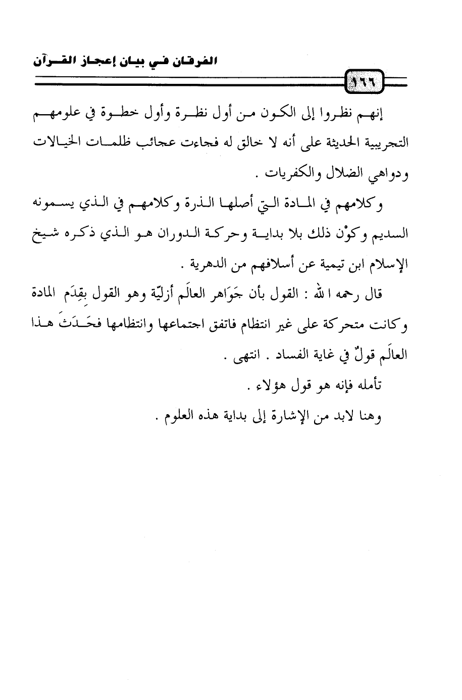 وكلامهم في المادة التي أصلها الذرَة وكلامهم في الذي يسمونه السديم وكوْن ذلك بلا بداية وحركة الدوران هو الذي ذكره شيخ الإسلام ابن تيمية عن أسلافهم الدهرية.
