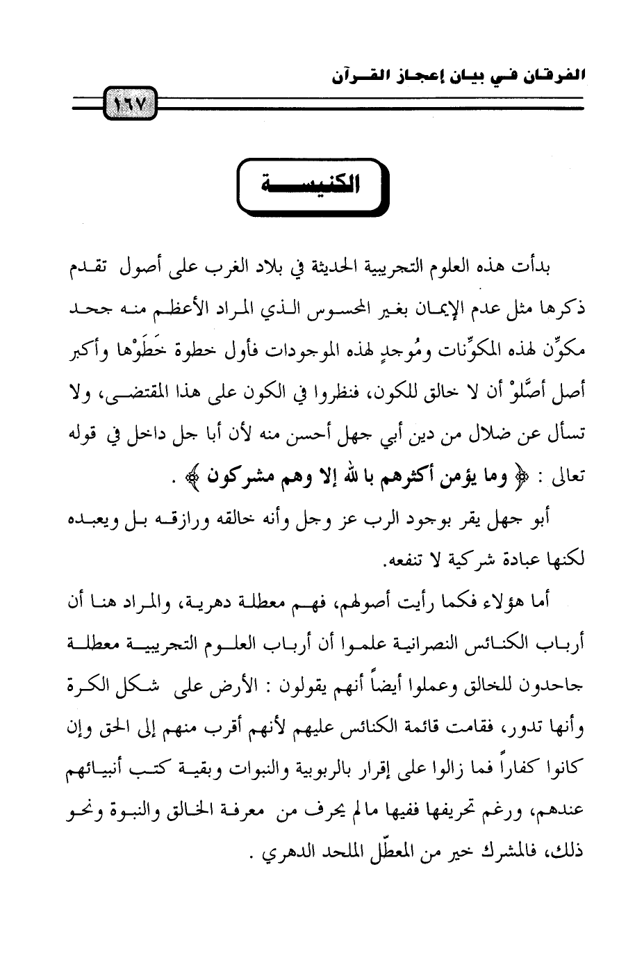 أما هؤلاء فكما رأيت أصولهم، فهم معطلة دهرية، والمراد هنا أن أرباب الكنائس النصرانية علموا أن أرباب العلوم التجريبية معطلة جاحدون للخالق وعملوا أيضاً أنهم يقولون: الأرض على شكل الكرة وأنها تدور، فقامت قائمة الكنائس عليهم لأنهم أقرب منهم إلى الحق وإن كانوا كفاراً فما زالوا على إقرار بالربوبية والنبوات وبقية كتب أنبيائهم عندهم، ورغم تحريفها ففيها ما لم يحرف من معرفة الخالق والنبوة ونحو ذلك، فالمشرك خير من المعطّل الملحد الدهري.