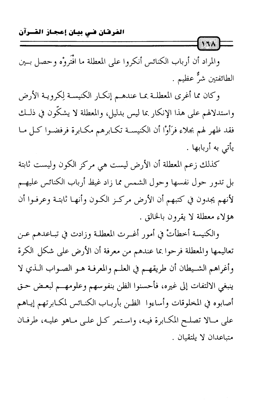 والكنيسة أخطأتْ في أمور أغرت المعطلة وزادت في تباعدهم عن تعاليمها والمعطلة فرحوا بما عندهم من معرفة أن الأرض على شكل الكرة وأغراهم الشيطان أن طريقهم في العلم والمعرفة هو الصواب الذي لا ينبغي الالتفات إلى غيره، فأحسنوا الظن بنفوسهم وعلومهم لبعض حق أصابوه في المخلوقات وأساءوا الظن بأرباب الكنائس لمكابرتهم إياهم على ما لا تصلح المكابرة فيه، واستمر كل على ما هو عليه، طرفان متباعدان لا يلتقيان.