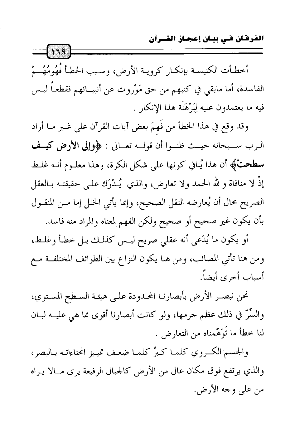 نحن نبصر الأرض بأبصارنا المحدودة على هيئة السطح المستوي، والسِّرّ في ذلك عظم جرمها، ولو كانت أبصارنا أقوى مما هي عليه لبان لنا خطأ ما تَوَهّمناه من التعارض.