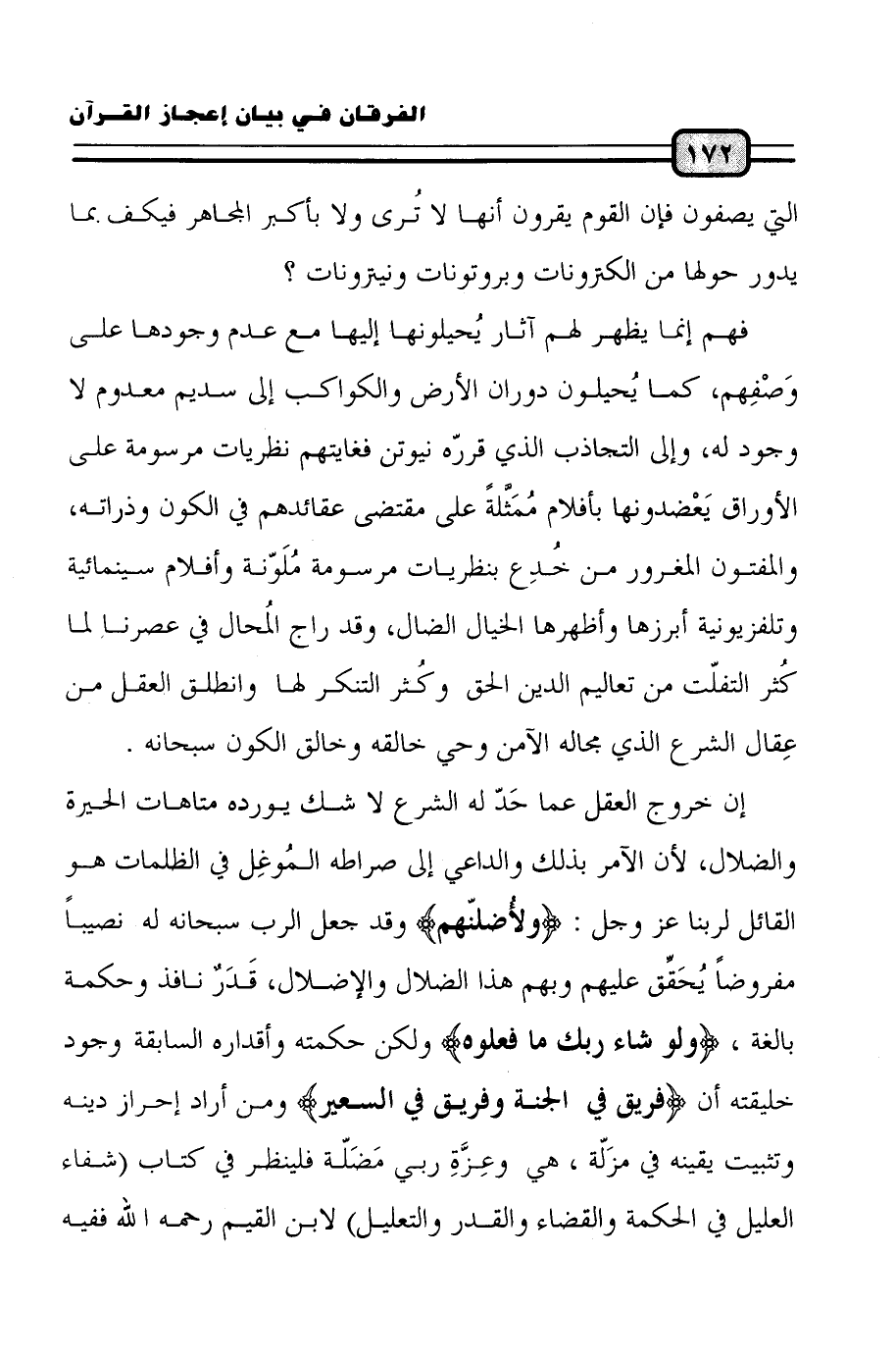 إن خروج العقل عما حَدّ له الشرع ولا شك يورده متاهات الحيرة والضلال، لأن الآمر بذلك والداعي إلى صراطه المُوغِل في الظلمات هو القائل لربنا عز وجل: (وَلأُضِلَّنَّهُمْ) وقد جعل الرب سبحانه له نصيباً مفروضاً يُحقِّق عليهم وبهم هذا الضلال والإضلال، قَدَرٌ نافذ وحكمة بالغة، (وَلَوْ شَاء رَبُّكَ مَا فَعَلُوهُ) ولكن حكمته وأقداره السابقة وجود خليقته أن (فَرِيقٌ فِي الْجَنَّةِ وَفَرِيقٌ فِي السَّعِيرِ) ومن أراد إحراز دينه وتثبيت يقينه في مزَلّة، هي وعِزَّةِ ربي مَضَلّة فلينظر في كتاب (شفاء العليل في الحكمة والقضاء والقدر والتعليل) لابن القيم رحمه الله ففيه