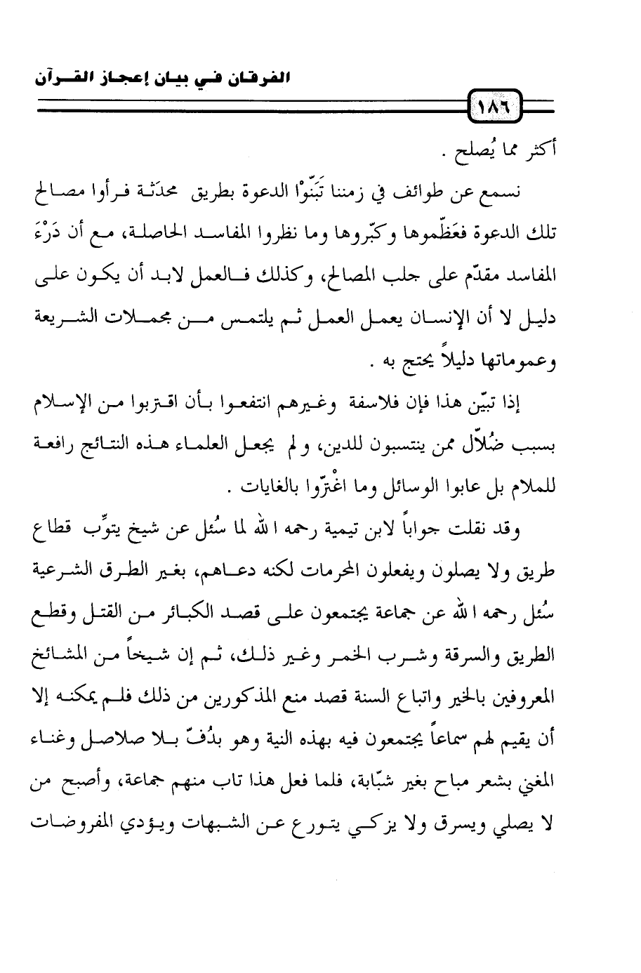 نسمع عن طوائف في زماننا تَبَنّوْا الدعوة بطريق محدَثة فرأوا مصالح تلك الدعوة فعَظّموها وكبّروها وما نظروا المفاسد الحاصلة، مع أن دَرْءّ المفاسد مقدّم على جلب المصالح، وكذلك فالعمل لا بد أن يكون على دليل لا أن الإنسان يعمل العمل ثم يلتمس من مجملات الشريعة وعموماتها دليلاً يحتج به.