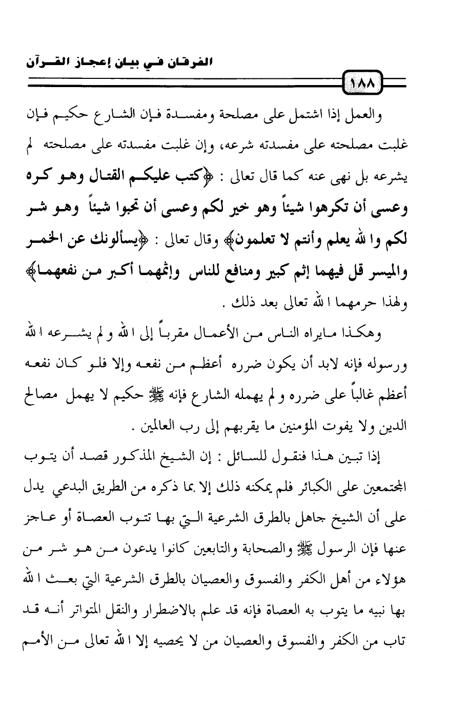 والعمل إذا اشتمل على مصلحة ومفسدة فإن الشارع حكيم فإن غلبت مصلحته على مفسدته شرعه، وإن غلبت مفسدته على مصلحته لم يشرعه بل نهى عنه كما قال تعالى: (كُتِبَ عَلَيْكُمُ الْقِتَالُ وَهُوَ كُرْهٌ لَّكُمْ وَعَسَى أَن تَكْرَهُواْ شَيْئاً وَهُوَ خَيْرٌ لَّكُمْ وَعَسَى أَن تُحِبُّواْ شَيْئاً وَهُوَ شَرٌّ لَّكُمْ وَاللهُ يَعْلَمُ وَأَنتُمْ لاَ تَعْلَمُونَ) وقال تعالى: (يَسْأَلُونَكَ عَنِ الْخَمْرِ وَالْمَيْسِرِ قُلْ فِيهِمَا إِثْمٌ كَبِيرٌ وَمَنَافِعُ لِلنَّاسِ وَإِثْمُهُمَا أَكْبَرُ مِن نَّفْعِهِمَا) ولهذا حرمهما الله تعالى بعد ذلك.