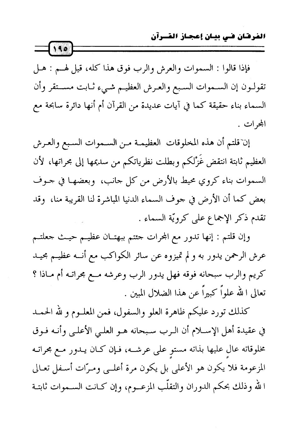 فإذا قالوا: السموات والعرش والرب فوق هذا كله، قيل لهم: هل تقولون إن السموات السبع والعرش العظيم شيء ثابت مستقر وأن السماء بناء حقيقة كما في آيات عديدة من القرآن أم أنها دائرة سابحة مع المجرات.