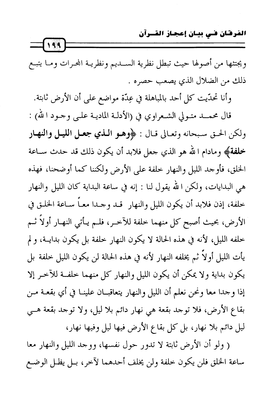 قال محمد متولي الشعراوي في (الأدلة المادية على وجود الله): ولكن الحق سبحانه وتعالى قال: (وَهُوَ الَّذِي جَعَلَ اللَّيْلَ وَالنَّهَارَ خِلْفَةً) وما دام الله هو الذي جعل فلا بد أن يكون ذلك قد حدث ساعة الخلق، فأوجد الليل والنهار خلفة على الأرض ولكننا كما أوضحنا، فهذه هي البدايات، ولكن الله يقول لنا: إن في ساعة البداية كان الليل والنهار خلفة، إذن فلا بد أن يكون الليل والنهار قد وجدا معاً ساعة الخلق في الأرض، بحيث أصبح كل منهما خلفة للآخر، فلم يأتي النهار أولاً ثم خلفه الليل، لأنه في هذه الحالة لا يكون النهار خلفة بل يكون بداية، ولم يأت الليل أولاً ثم يخلفه النهار لأنه في هذه الحالة لن يكون الليل خلفة بل يكون بداية ولا يمكن أن يكون الليل والنهار كل منهما خلفة للآخر إلا إذا وجدا معاً ونحن نعلم أن الليل والنهار يتعاقبان علينا في أي بقعة من بقاع الأرض، فلا توجد بقعة هي نهار دائم بلا ليل، ولا توجد بقعة هي ليل دائم بلا نهار، بل كل بقاع الأرض فيها ليل وفيها نهار.