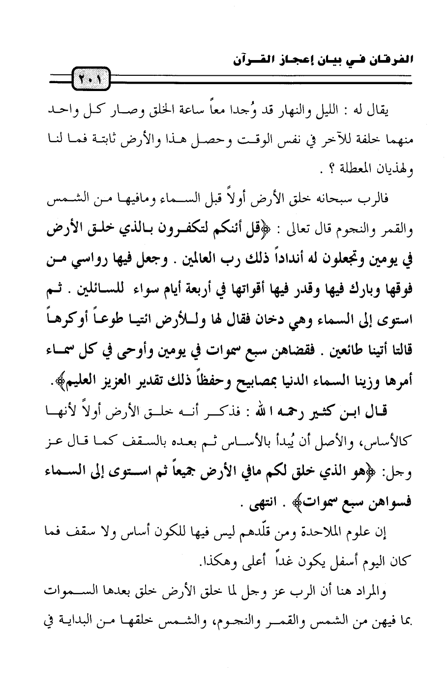 فالرب سبحانه خلق الأرض أولاً قبل السماء وما فيها من الشمس والقمر والنجوم قال تعالى: (قُلْ أَئِنَّكُمْ لَتَكْفُرُونَ بِالَّذِي خَلَقَ الأَرْضَ فِي يَوْمَيْنِ وَتَجْعَلُونَ لَهُ أَندَاداً ذَلِكَ رَبُّ الْعَالَمِينَ * وَجَعَلَ فِيهَا رَوَاسِيَ مِن فَوْقِهَا وَبَارَكَ فِيهَا وَقَدَّرَ فِيهَا أَقْوَاتَهَا فِي أَرْبَعَةِ أَيَّامٍ سَوَاء لِّلسَّائِلِينَ * ثُمَّ اسْتَوَى إِلَى السَّمَاء وَهِيَ دُخَانٌ فَقَالَ لَهَا وَلِلأَرْضِ اِئْتِيَا طَوْعاً أَوْ كَرْهاً قَالَتَا أَتَيْنَا طَائِعِينَ * فَقَضَاهُنَّ سَبْعَ سَمَوَاتٍ فِي يَوْمَيْنِ وَأَوْحَى فِي كُلِّ سَمَاء أَمْرَهَا وَزَيَّنَّا السَّمَاء الدُّنْيَا بِمَصَابِيحَ وَحِفْظاً ذَلِكَ تَقْدِيرُ الْعَزِيزِ الْعَلِيمِ).
