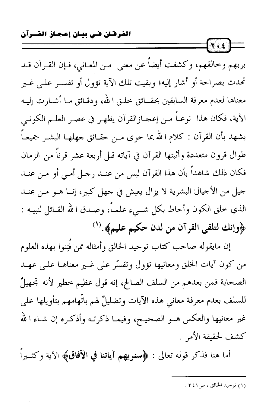 بربهم وخالقهم وكشفت أيضاً عن معنى من المعاني، فإن القرآن قد تحدث بصراحة أو أشار إليه؛ وبقيت تلك الآية تؤول أو تفسر على غير معناها لعدم معرفة السابقين بحقائق خلق الله، ودقائق ما أشارت إليه الآية، فكان هذا نوعاً من إعجاز القرآن يظهر في عصر العلم الكوني يشهد بأن القرآن: كلام الله بما حوى من حقائق جهلها البشر جميعاً طوال قرون متعددة وأثبتها القرآن في آياته قبل أربعة عشر قرناً من الزمان فكان ذلك شاهداً بأن هذا القرآن ليس من عند رجل أمي أو من عند جيل من الأجيال البشرية لا يزال يعيش في جهل كبير إنما هو من عند الذي خلق الكون وأحاط بكل شيء علماً، وصدق الله القائل لنبيه: (وَإِنَّكَ لَتُلَقَّى الْقُرْآنَ مِن لَّدُنْ حَكِيمٍ عَلِيمٍ) (¬1).