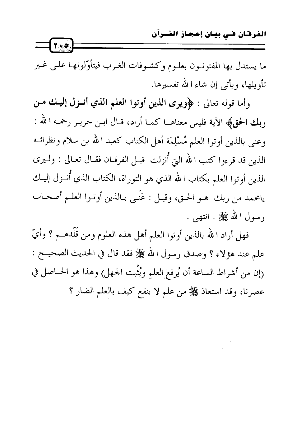 وأما قوله تعالى: (وَيَرَى الَّذِينَ أُوتُوا الْعِلْمَ الَّذِي أُنزِلَ إِلَيْكَ مِن رَّبِّكَ هُوَ الْحَقَّ) الآية فليس معناها كما أراد، قال ابن جرير رحمه الله: وعنى بالذين أوتوا العلم مُسْلِمَة أهل الكتاب كعبد الله بن سلام ونظرائه الذين قد قرءوا كتب الله التي أُنزلت قبل الفرقان فقال تعالى: وليرى الذين أوتوا العلم بكتاب الله الذي هو التوراة، الكتاب الذي أُنزل إليك يا محمد من ربك هو الحق، وقيل: عَنَى بالذين أوتوا العلم أصحاب رسول الله صلى الله عليه وسلم. انتهى.