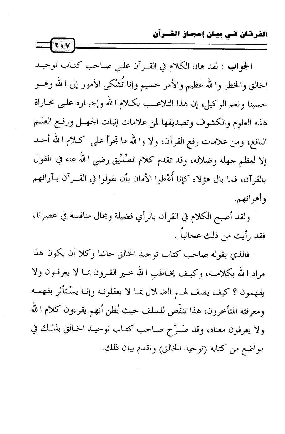 الجواب: لقد هان الكلام في القرآن على صاحب كتاب توحيد الخالق والخطر والله عظيم والأمر جسيم وإنما تُشْكى الأمور إلى الله وهو حسبنا ونعم الوكيل، إن هذا التلاعب بكلام الله وإجباره على مجاراة هذه العلوم والكشوف وتصديقها لمن علامات إثبات الجهل ورفع العلم النافع، ومن علامات رفع القرآن، ولا والله ما تجرأ على كلام الله أحد إلا لعظم جهله وضلاله، وقد تقدم كلام الصِّديق رضي الله عنه في القول بالقرآن فما بال هؤلاء كأنما أُعطوا الأمان بأن يقولوا في القرآن بآرائهم وأهوائهم.