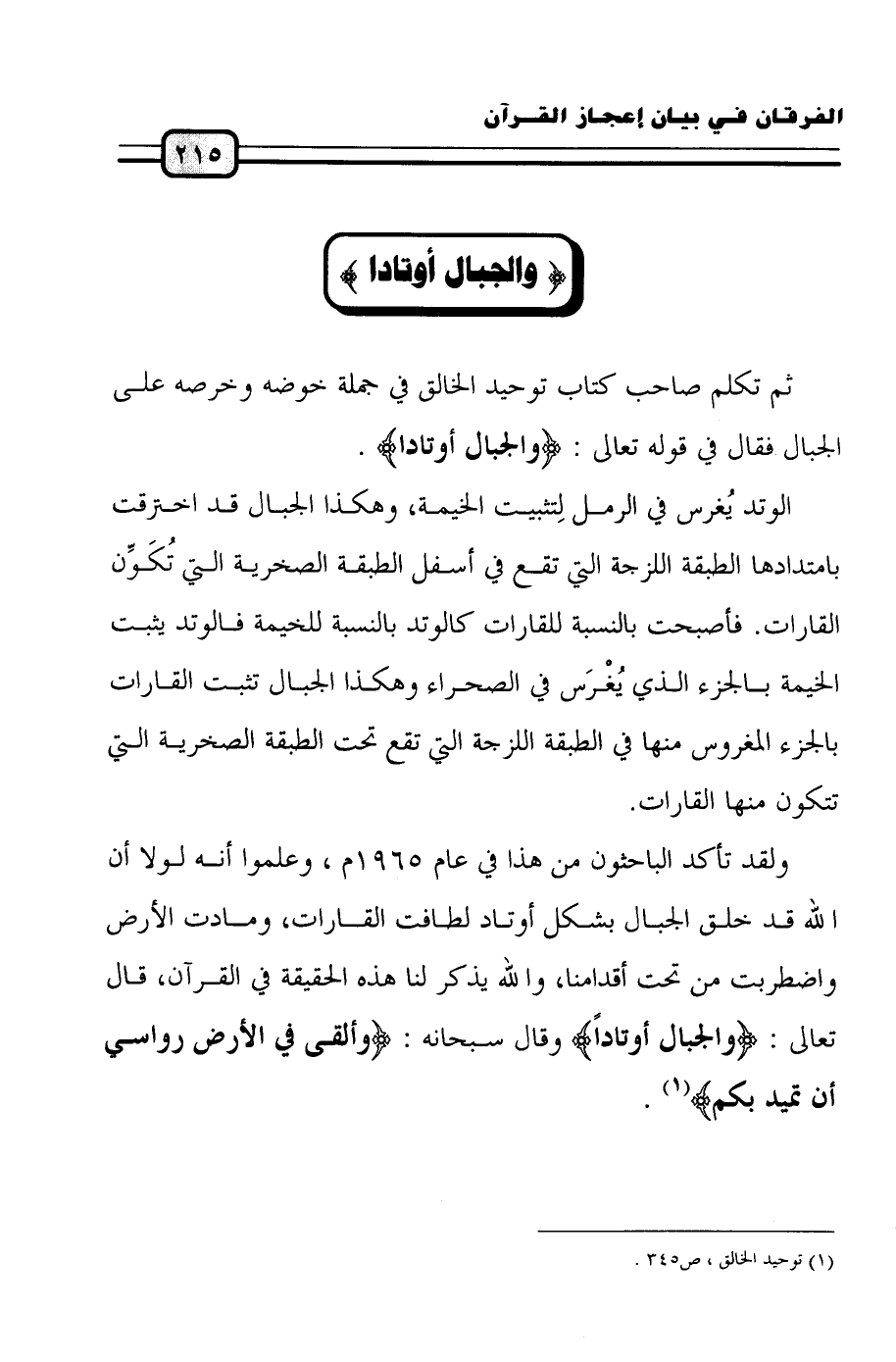 ثم تكلم صاحب كتاب توحيد الخالق في جملة خوضه وخرصه على الجبال فقال: في قوله تعالى: (وَالْجِبَالَ أَوْتَاداً).