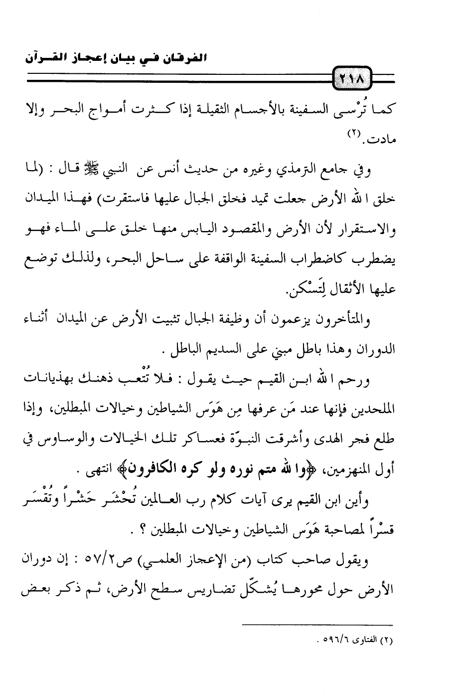 وفي جامع الترمذي وغيره من حديث أنس عن النبي صلى الله عليه وسلم قال: (لما خلق الله الأرض جعلت تميد فخلق الجبال عليها فاستقرت) (¬2) فهذا الميدان والاستقرار لأن الأرض والمقصود اليابس منها خلق على الماء فهو يضطرب اضطراب السفينة الواقفة على ساحل البحر، ولذلك توضع عليها الأثقال لِتَسْكن.