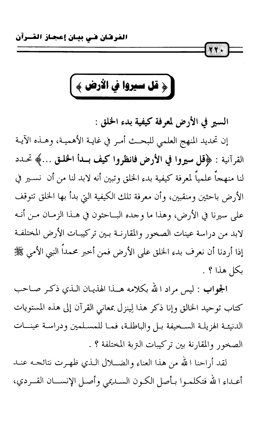 قال صاحب كتاب توحيد الخالق: (إن تحديد المنهج العلمي للبحث أمر في غاية الأهمية، وهذه الآية القرآنية: (قُلْ سِيرُوا فِي الأَرْضِ فَانظُرُوا كَيْفَ بَدَأَ الْخَلْقَ ... ) تحدد لنا منهجاً علمياً لمعرفة كيفية بدء الخلق وتبين أنه لا بد لنا من أن نسير في الأرض باحثين ومنقبين، وأن معرفة تلك الكيفية التي بدأ بها الخلق تتوقف على سيرنا على الأرض، وهذا ما وجده الباحثون في هذا الزمان من أنه لا بد من دراسة عينات الصخور والمقارنة بين تركيبات الأرض المختلفة إذا أردنا أن نعرف بدء الخلق على الأرض فمن أخبر محمداً النبي الأمي صلى الله عليه وسلم بكل هذا؟.