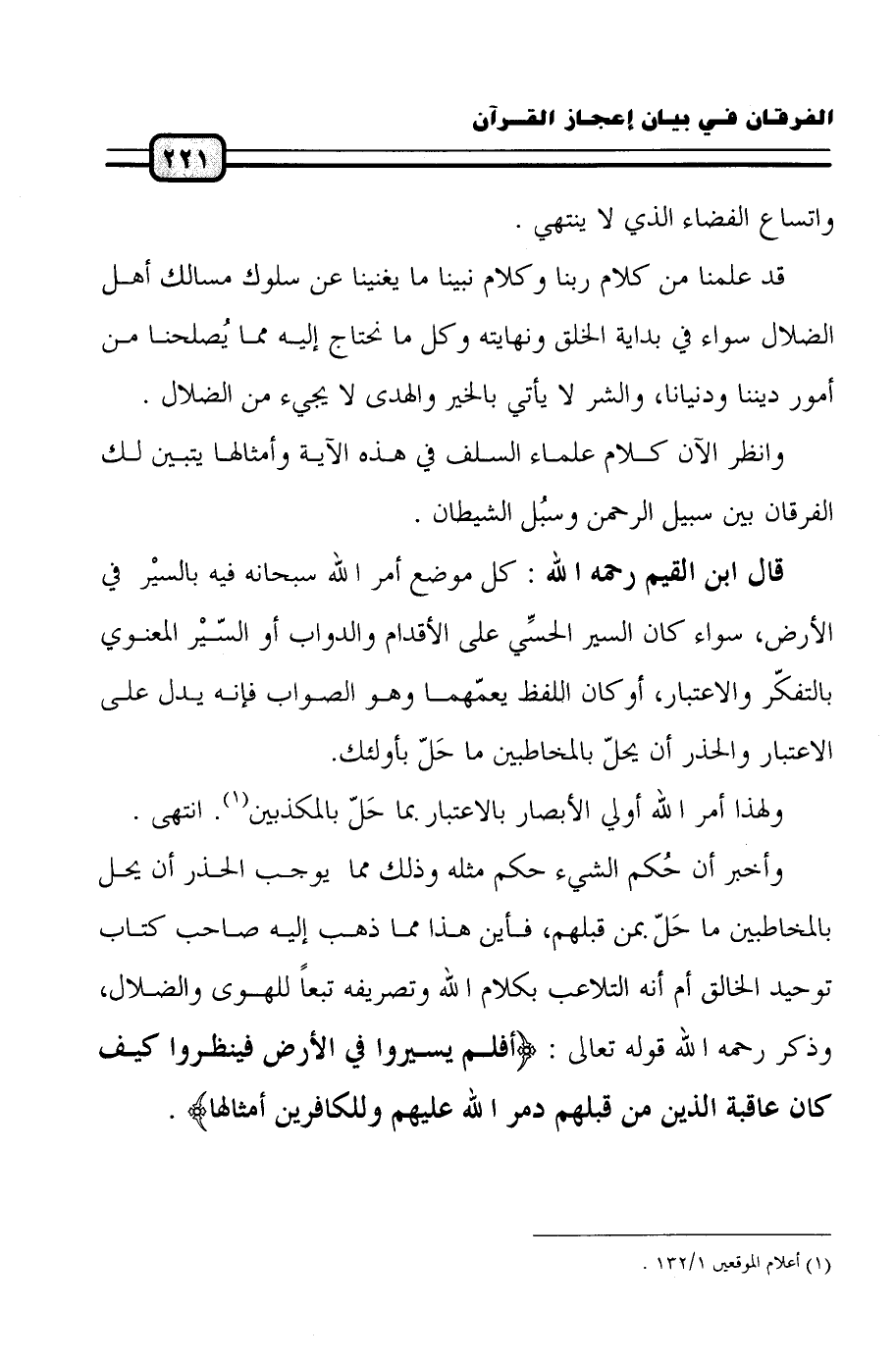 قال ابن القيم رحمه الله: كل موضع أمر الله سبحانه فيه بالسير في الأرض، سواء كان السير الحسِّي على الأقدام والدواب أو السير المعنوي بالتفكّر والاعتبار، أو كان اللفظ يعمّهما وهو الصواب فإنه يدل على الاعتبار والحذر أن يحلّ بالمخاطبين ما حَلّ بأولئك.
