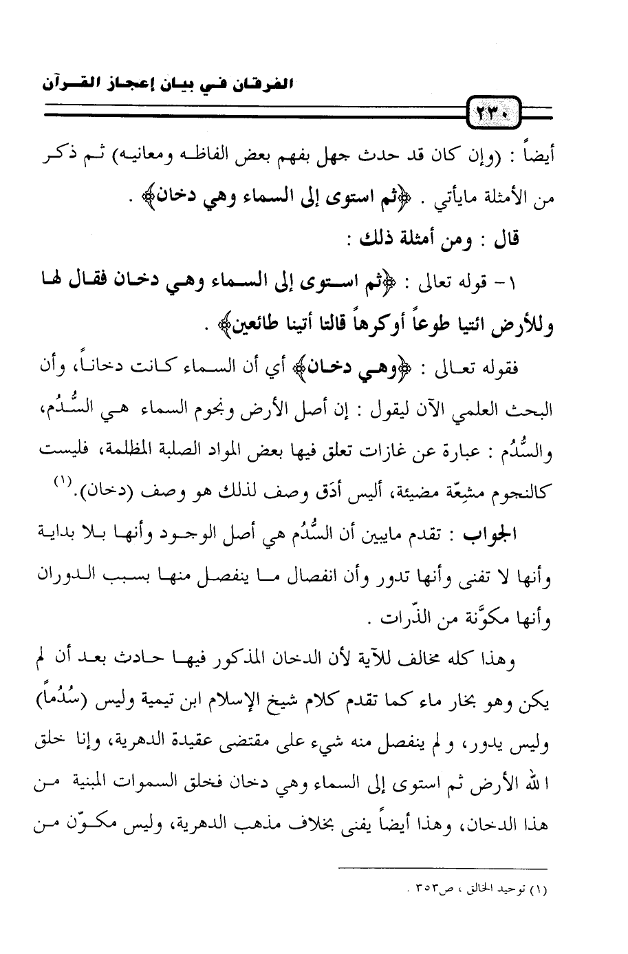 وهذا كله مخالف للآية لأن الدخان المذكور فيها حادث بعد أن لم يكن وهو بخار ماء كما تقدم كلام شيخ الإسلام ابن تيمية وليس (سُدُماً) وليس يدور، ولم ينفصل منه شيء على مقتضى عقيدة الدهرية، وإنما خلق الله الأرض ثم استوى إلى السماء وهي دخان فخلق السموات المبنية من هذا الدخان، وهذا أيضاً يفنى بخلاف مذهب الدهرية، وليس مكوّن من